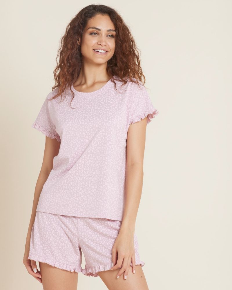 Pigiama donna in cotone, top manica corta pantalone corto con stampa microfantasia a fiori e rouches