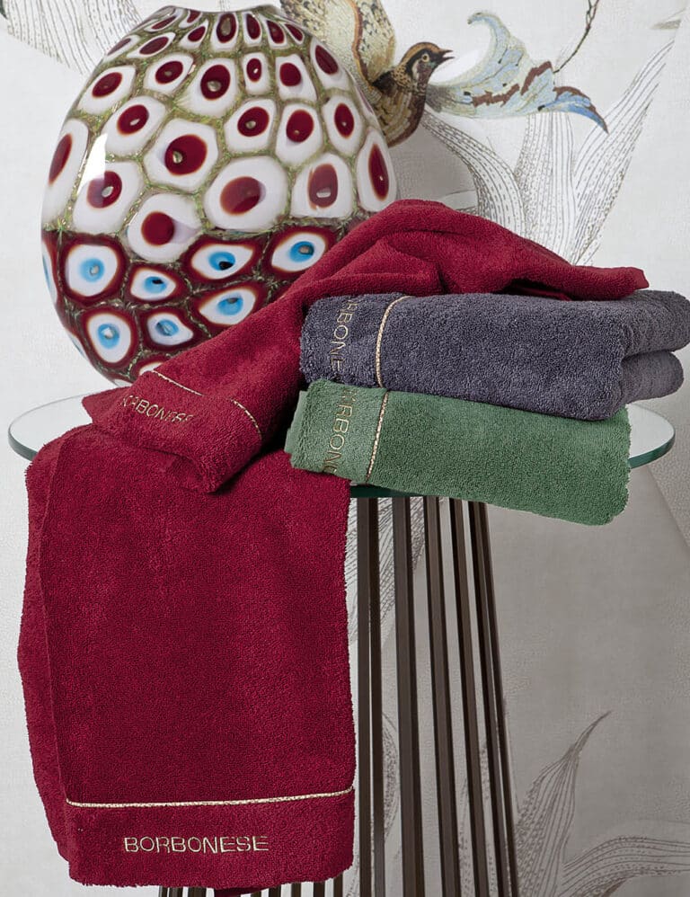 Set Viso e Ospite realizzato con spugna 100% cotone da 550 gr/m2. Bordo con logo Borbonese ricamato e codina di topo con il motivo iconico OP Occhio di Pernice.