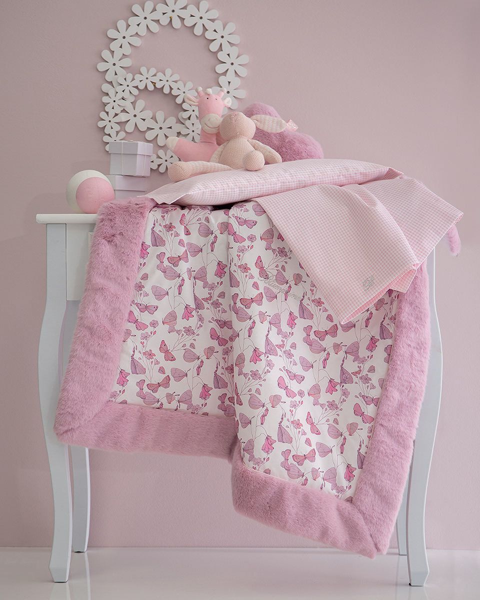 Copriletto per culla con bordo in morbidissima pelliccia sintetica su tre lati con logo Blumarine in cristalli.