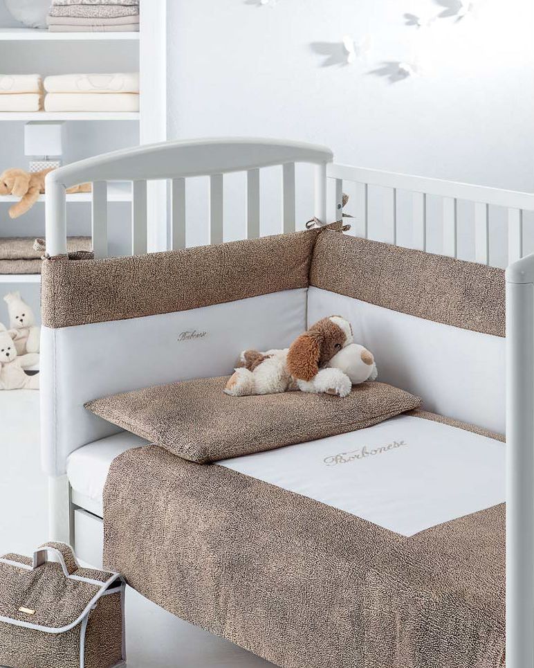 Set 5 pezzi da Lettino in percalle di cotone stampato con inserti in piquet millerighe e ricamo