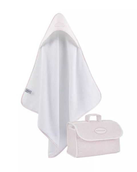 Triangolo in spugna 100% cotone con cappuccio doppiato in percalle 200 T.C stampato con iconico motivo “OP” Occhio di Pernice, logo Borbonese ricamato sul cappuccio e rifinito con sbieco.