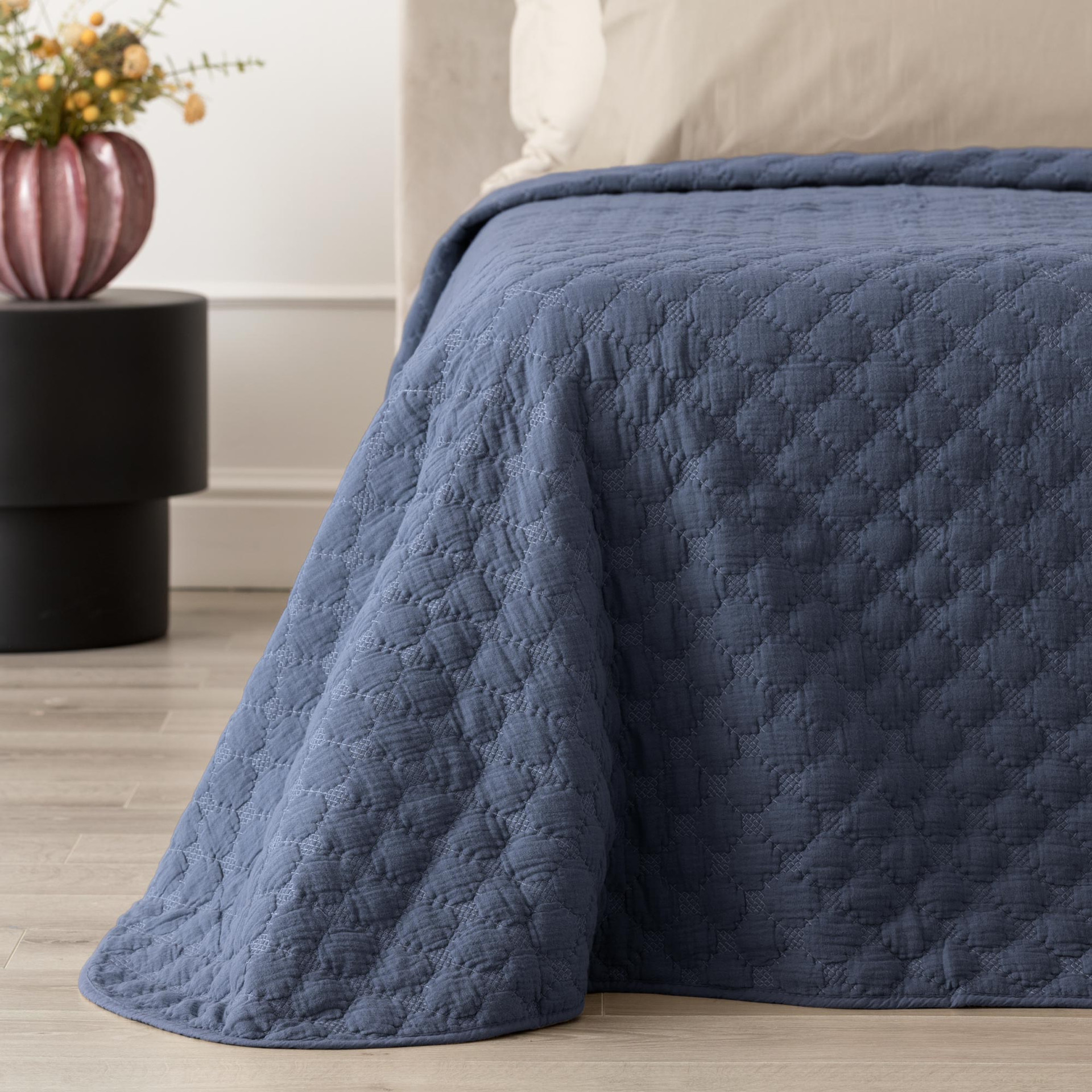 Il quilt Rombus in mussola di cotone si caratterizza per una lavorazione ricamata a motivo geometrico che dona profondità e movimento alla superficie rifinita. La texture morbida della mussola garment washed esalta l’effetto naturale del tessuto, creando un copriletto dall’estetica contemporanea ma accogliente.