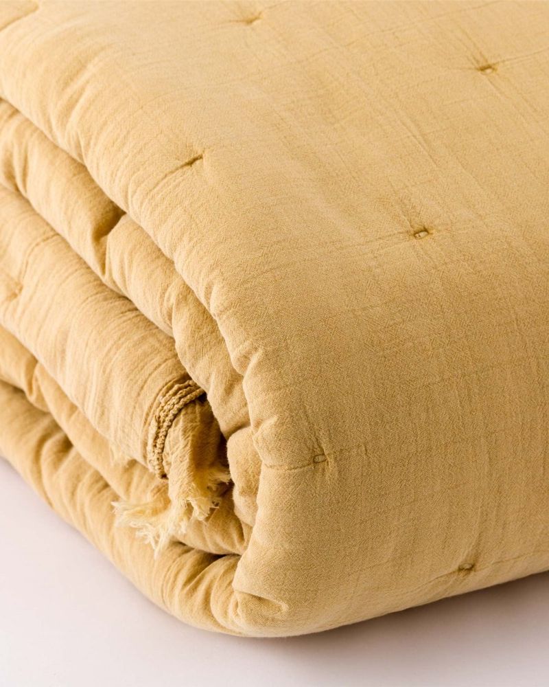 Trapuntino in 100% cotone stone washed, con imbottitura 100 gr, finitura con rouches sfrangiata e crochet.