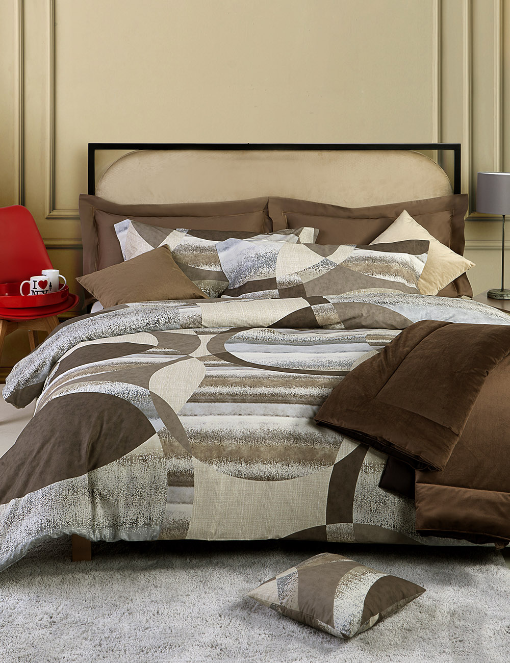 Sacca copripiumino e federe a 2 volant stampati in digitale con motivi geometrici;