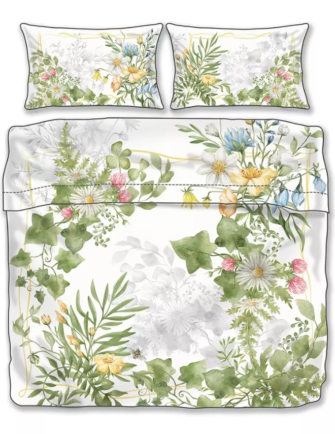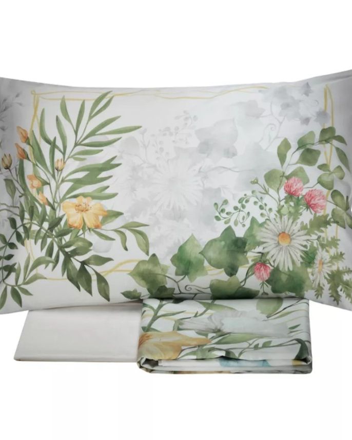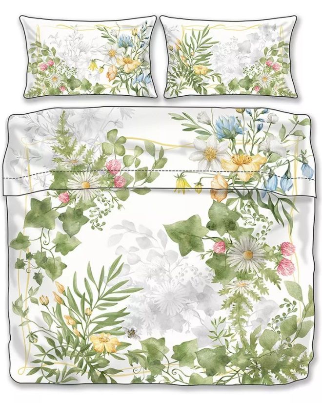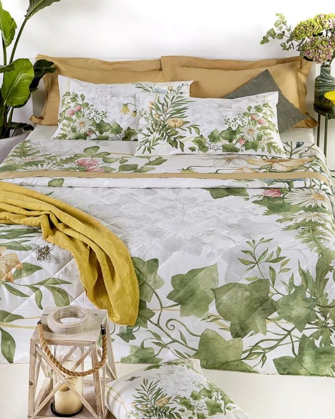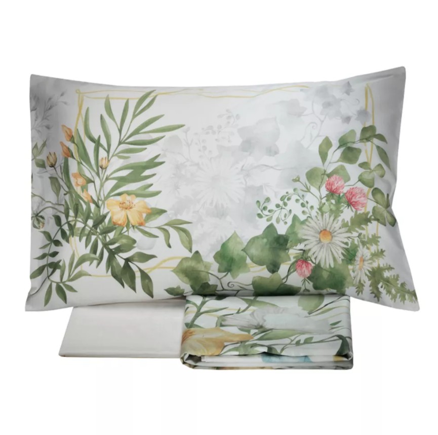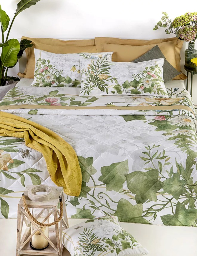 Il lenzuolo e la parte superiore delle federe sono stampate in digitale il resto in tinta unita