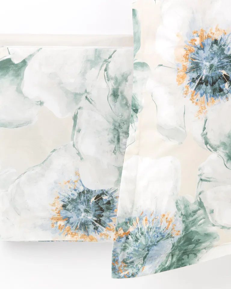 La confezione contiene lenzuolo sopra in raso di cotone stampato con balza applicata, lenzuolo sotto in raso di cotone in tinta unita con angoli elastici.