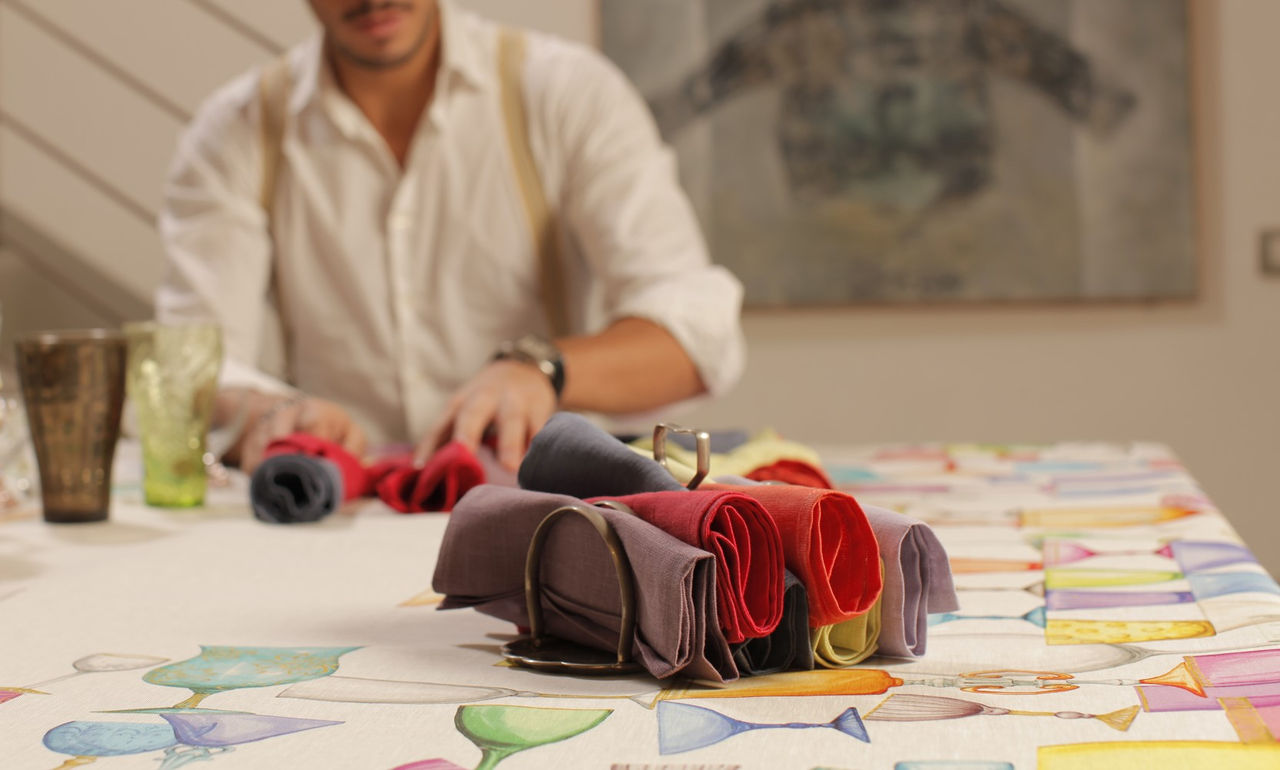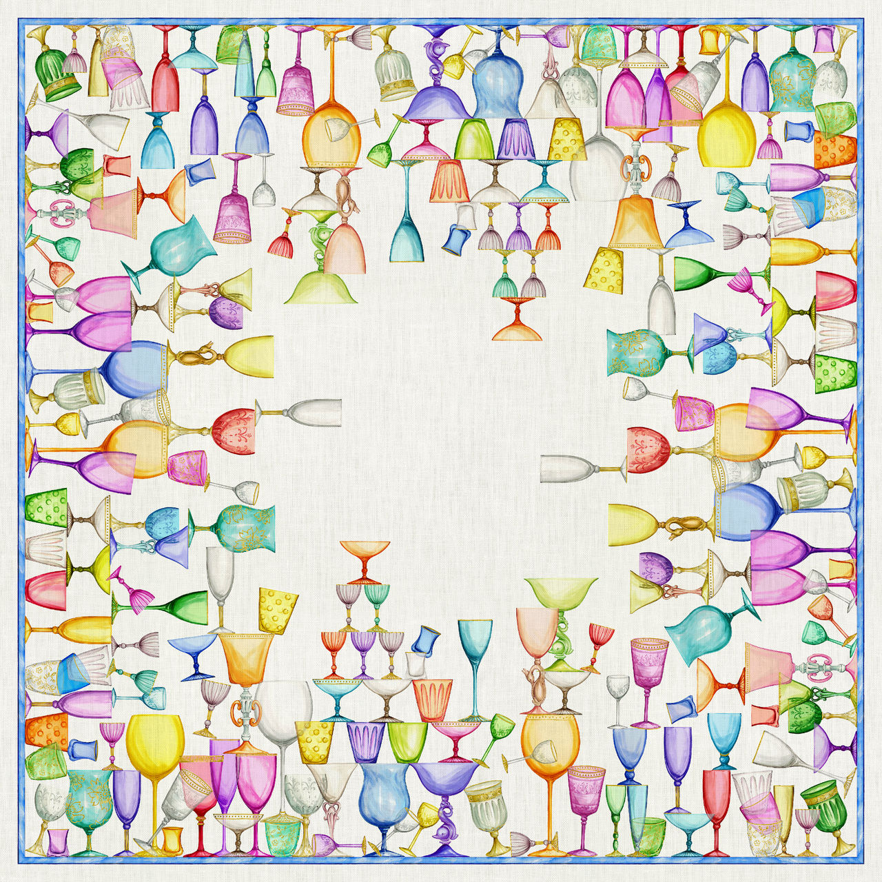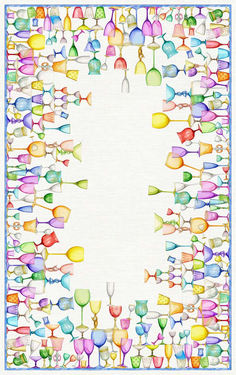 Crystal è una tovaglia stampata su puro lino sbiancato. Abbiamo voluto disegnare tanti bicchieri elaborati e barocchi, dai colori esplosivi, ammassati appena usciti dalle fucine di Murano in una una architettura ambiziosa e fragile. Metti in scena la tua personalità colorata e brillante come un bicchiere di cristallo da trattare con cura e delicatezza. E la serata è appena all’inizio!