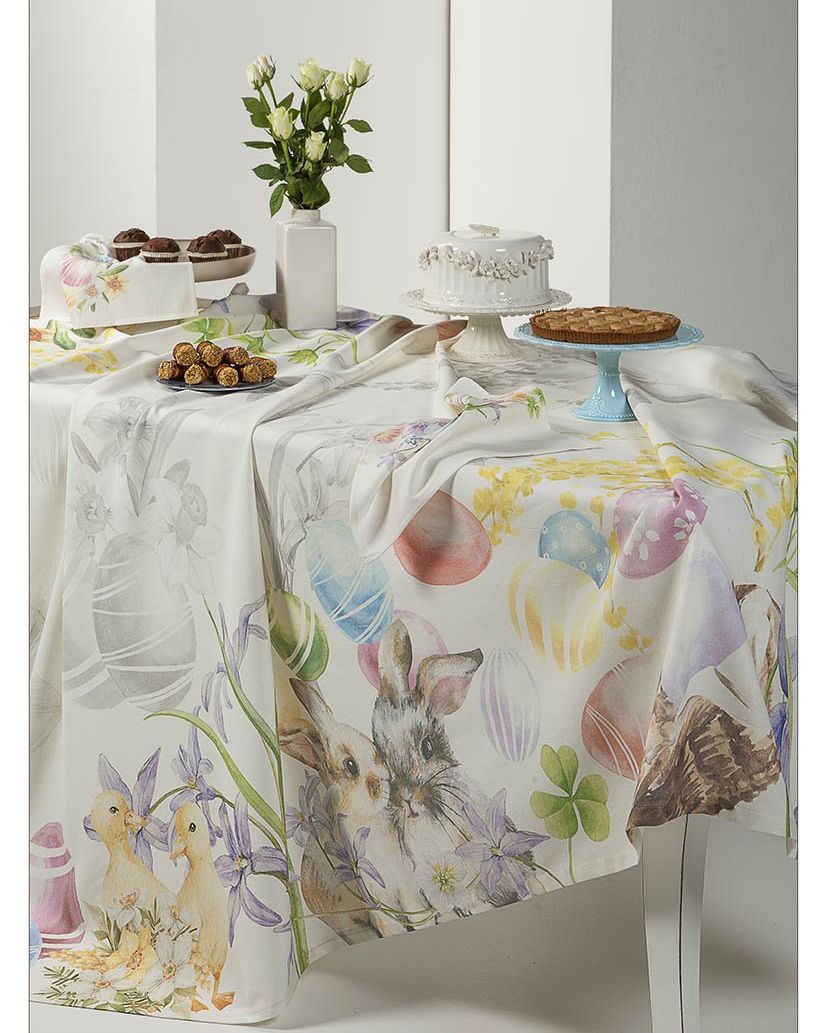 Tovaglia con fantasia Pasquale in misto lino stampato e tovaglioli fantasia