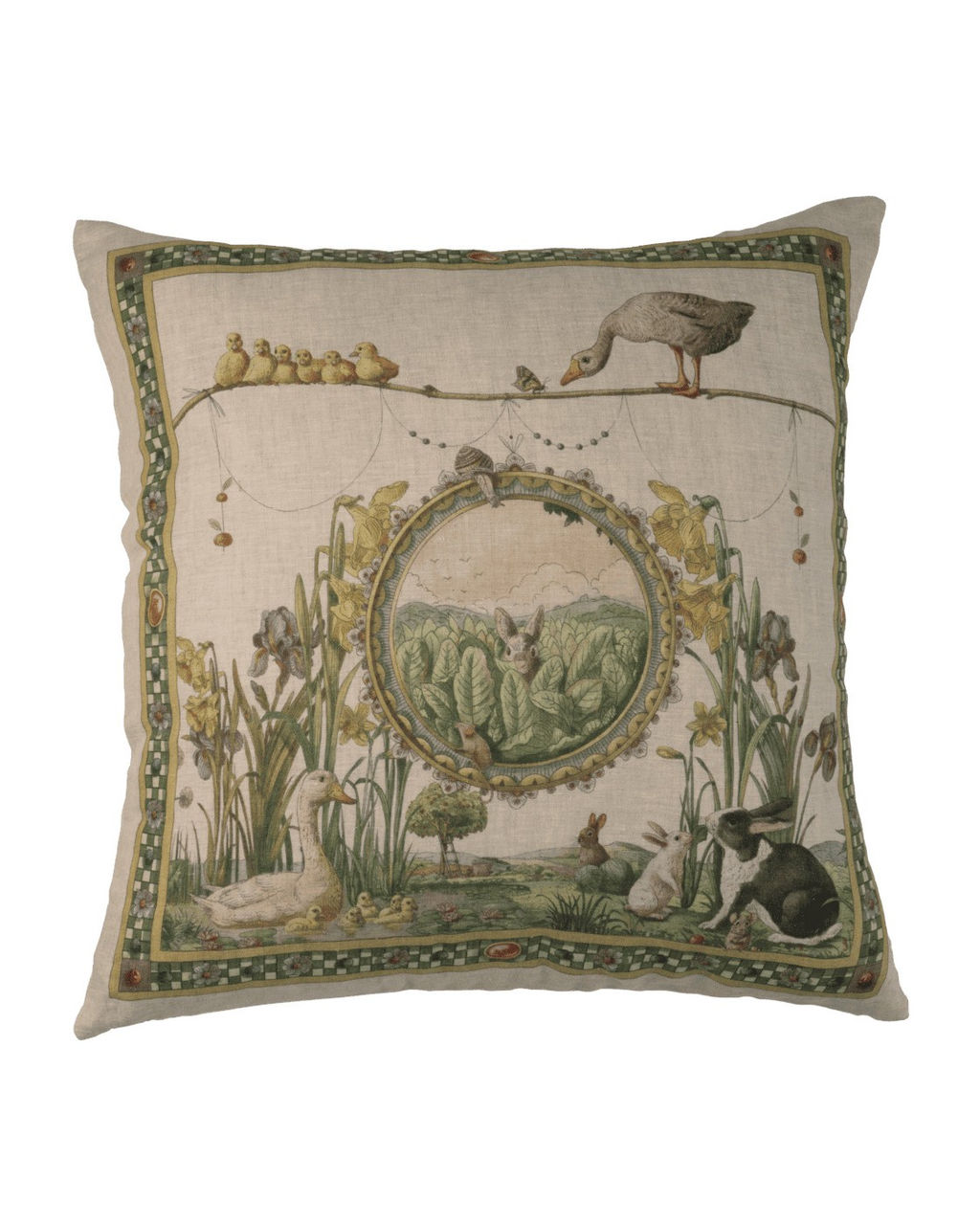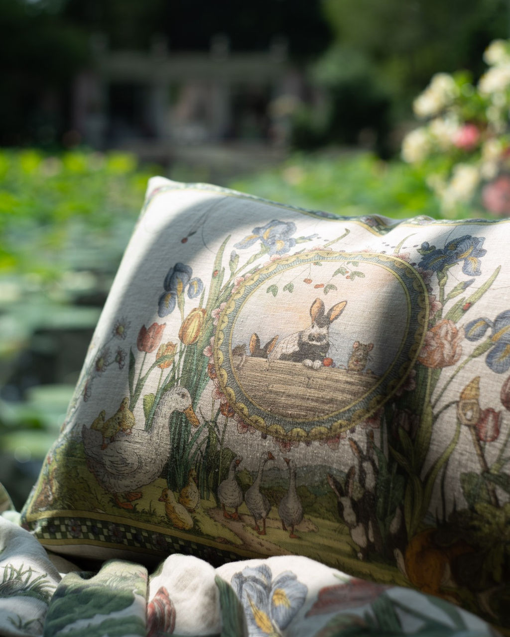Il cuscino decorativo BUNNY GARDEN racconta una scena bucolica dal fascino senza tempo, perfetta per celebrare anche l’atmosfera dolce e luminosa della Pasqua. Coniglietti curiosi, anatroccoli e piccoli dettagli floreali si intrecciano in una composizione ricca e delicata, incorniciata da motivi ornamentali che ne esaltano l’eleganza.