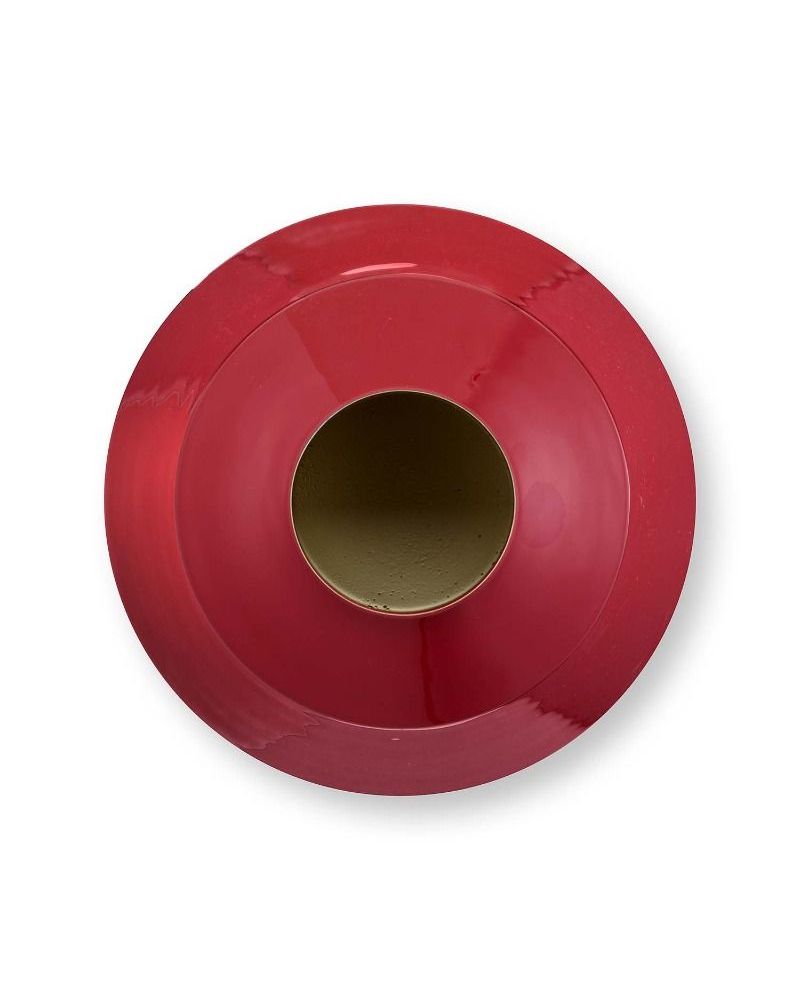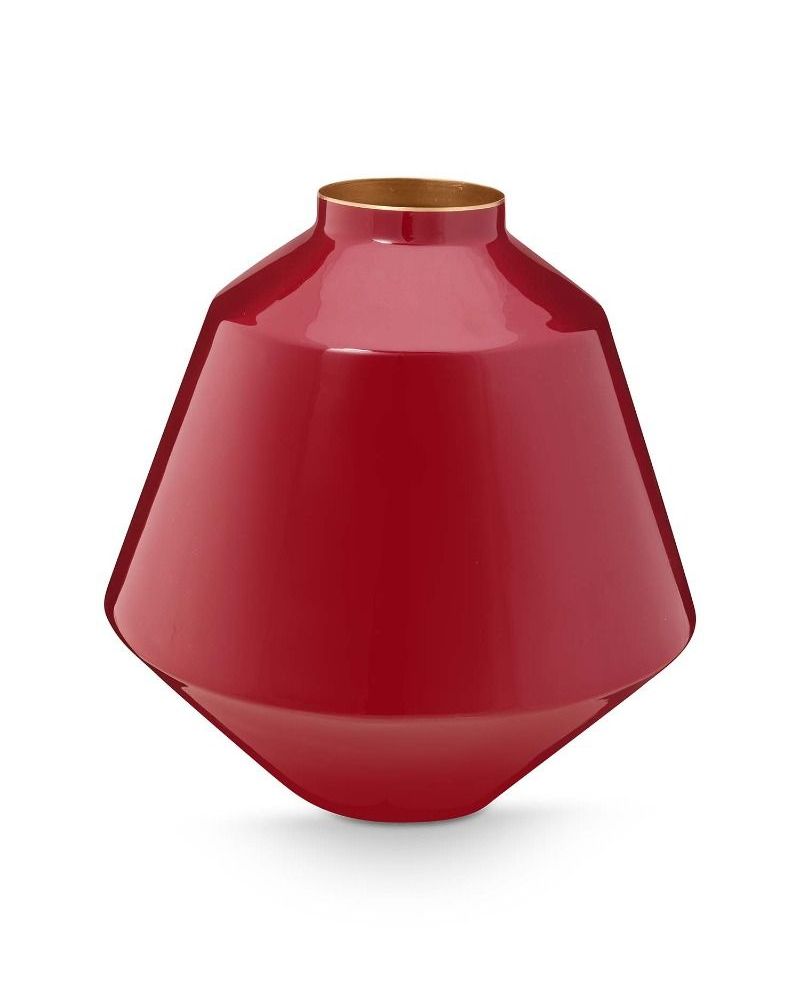 Dai un tocco di colore alla tua casa con questo grande vaso in metallo rosso dalla forma stravagante.