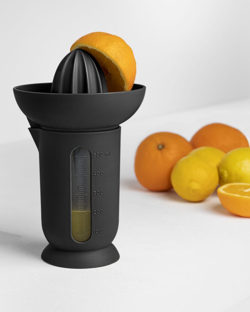 Spremiagrumi in polipropilene, stabile e pratico, abbinato alla Caraffa QB graduata 500 ml, con beccuccio salvagoccia