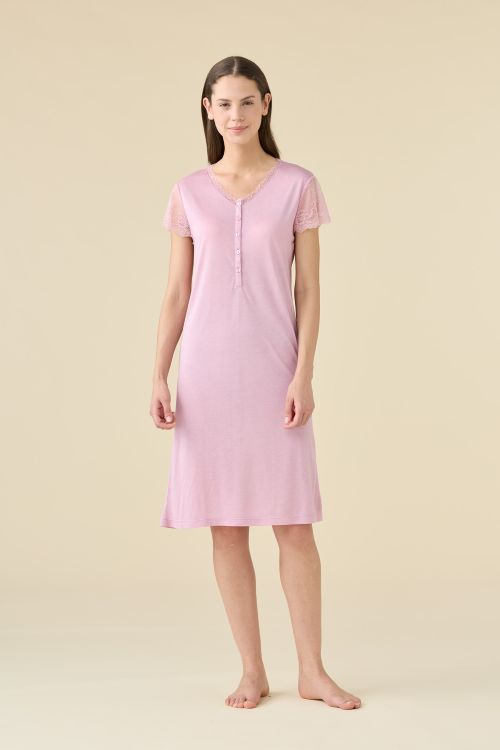 Camicia da notte donna estiva in modal. Manica corta in pizzo e collo a cinque bottoni.