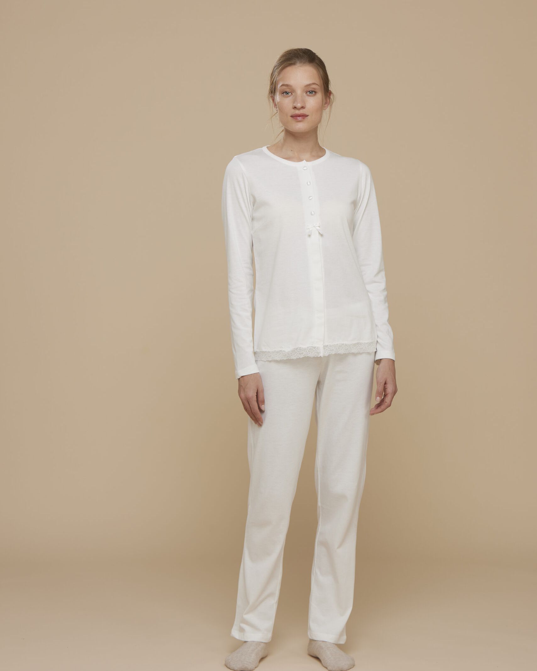 Pigiama donna jersey invernale, top manica lunga aperto sul davanti con abbottonatura nascosta e dettagli in pizzo e pantalone lungo senza polsino