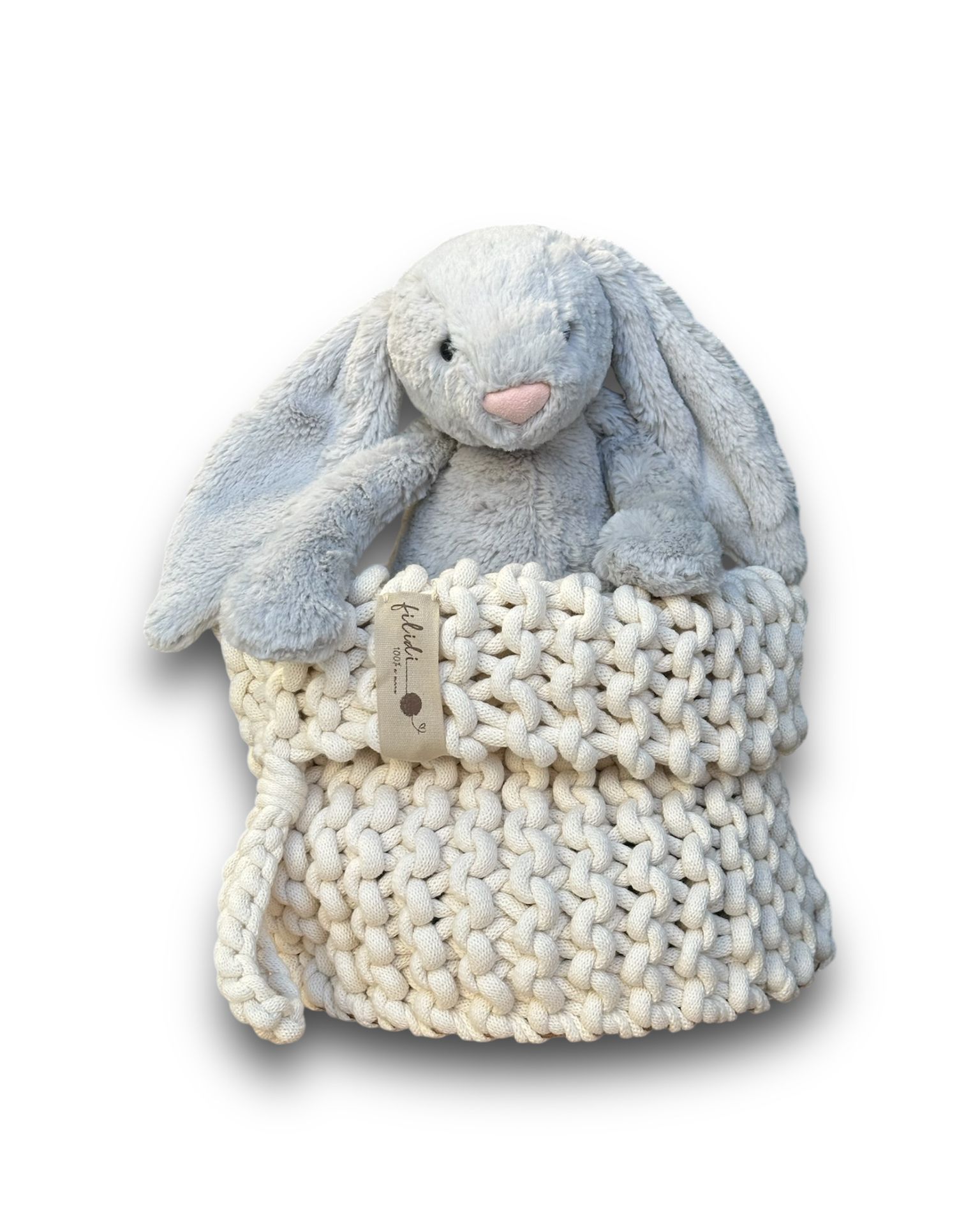 All’interno il cesto può contenere di tutto: piante, giocattoli, coperte, riviste, o prodotti per la cura personale. Il cesto è dotato di manico all’uncinetto che ne facilita il trasporto da una stanza all’altra.