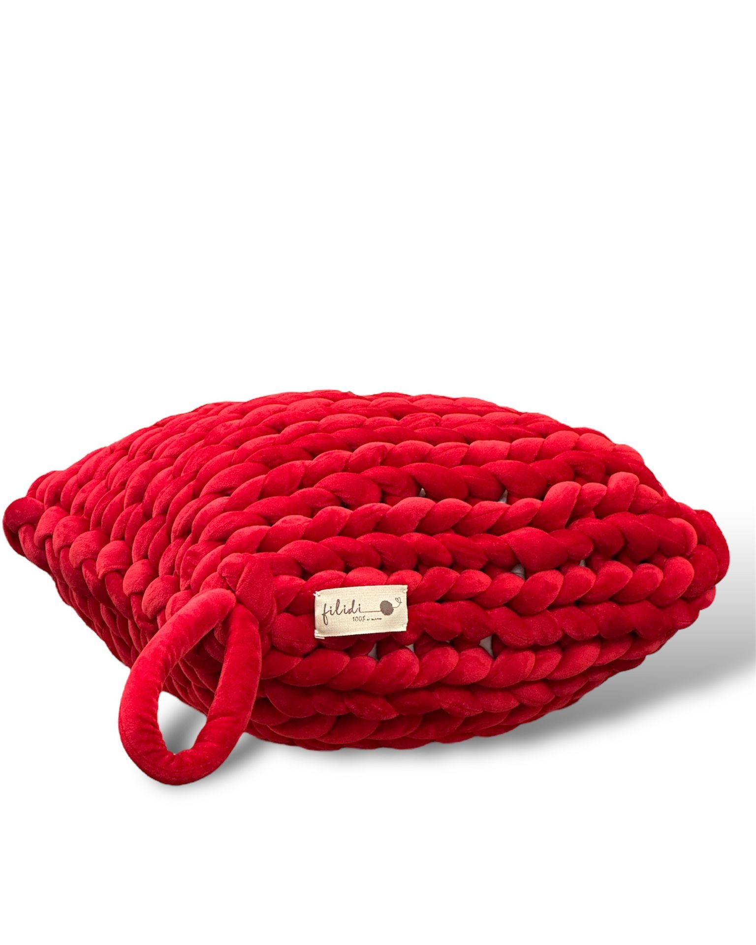 Cuscino d’arredo realizzato a mano, avvolto in un morbido filato maxi in velluto. La superficie è lussureggiante e accogliente, invitando a poggiare la testa o ad appoggiarsi con piacere. Il velluto, con il suo delicato luccichio, cattura la luce in modo unico, creando giochi di ombre e riflessi che aggiungono profondità al design.