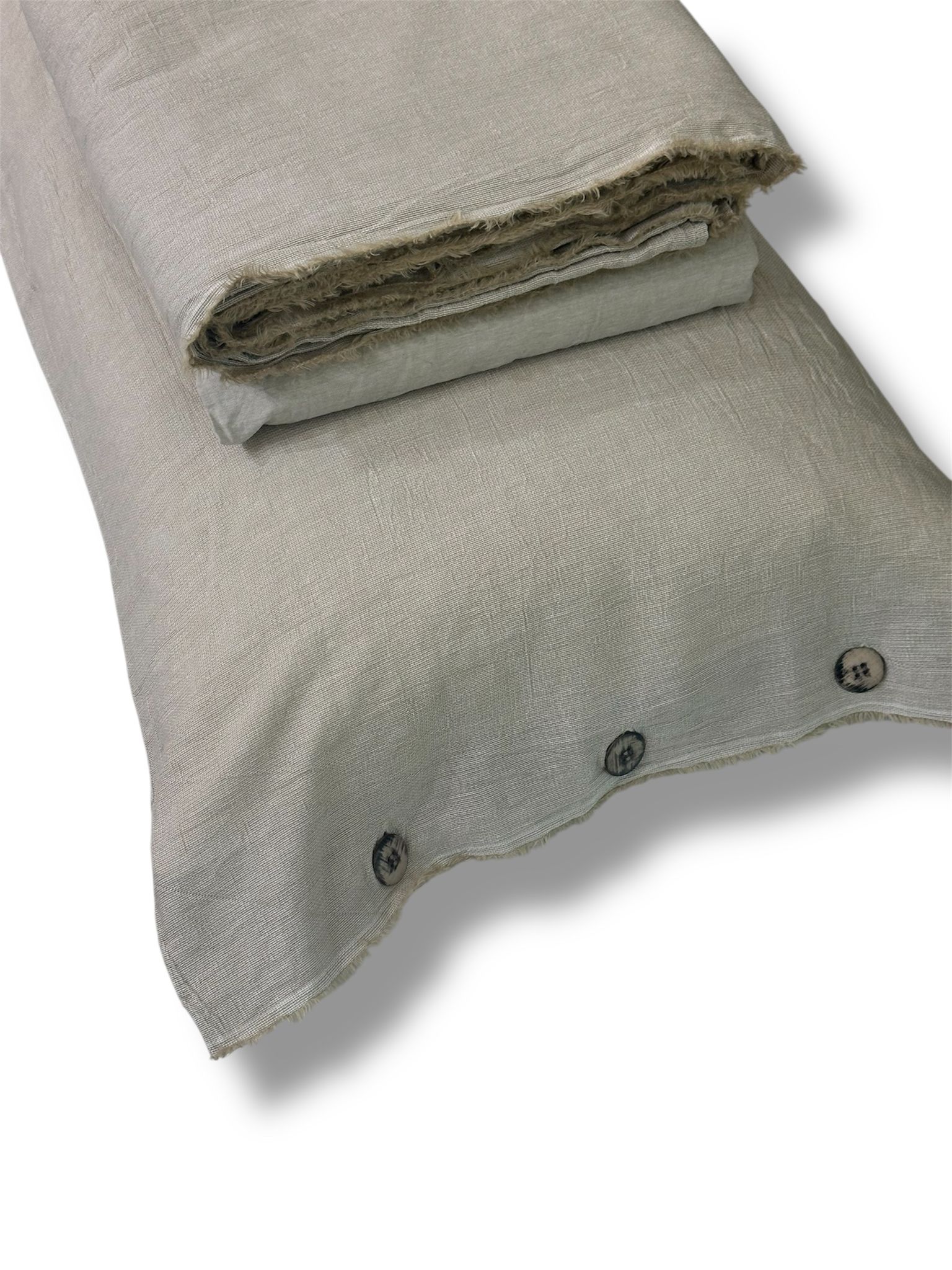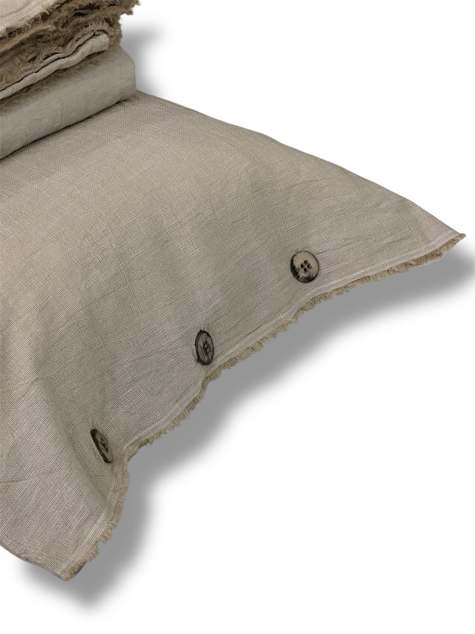 Contenuto della confezione: 1 lenzuolo sopra 250×280 cm ; 1 lenzuolo sotto con angoli 180×200 cm ; 2 federe 50×80 rifinite con bottoni e frangia.