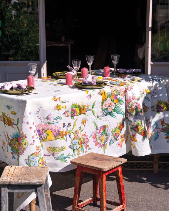 La tovaglia colorata PESCIFLORA racchiude in sé il fascino della fantasia e mostra un mondo sommerso tra i fondali marini e i bouquet in fiore.
