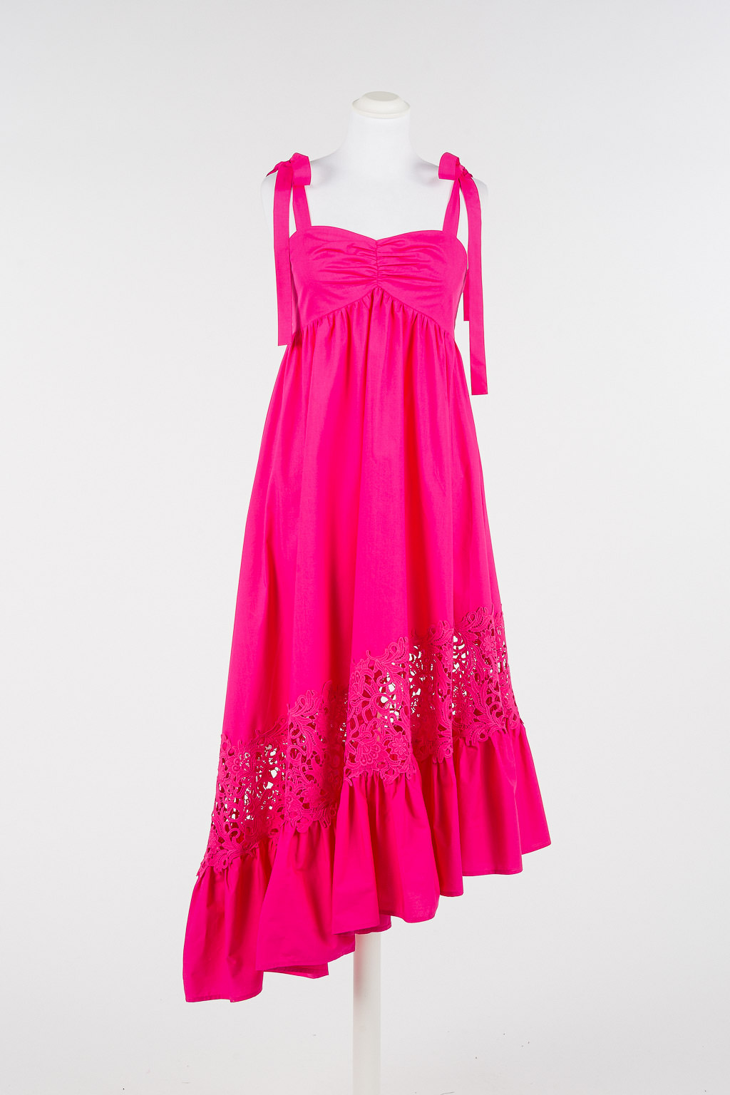 Abito asimmetrico con bretelle e ricamo crochet.