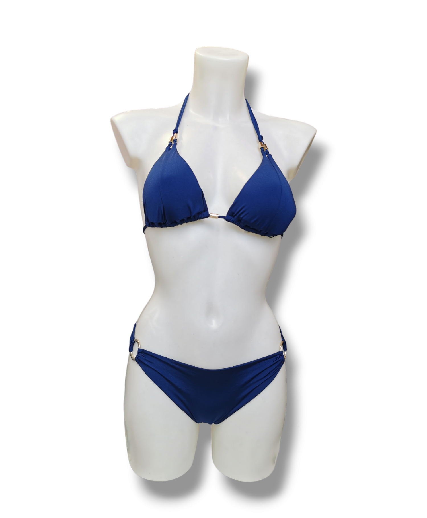 Bikini triangolo con oblò e nodi, imbottitura con coppe estraibili. Coppa B.