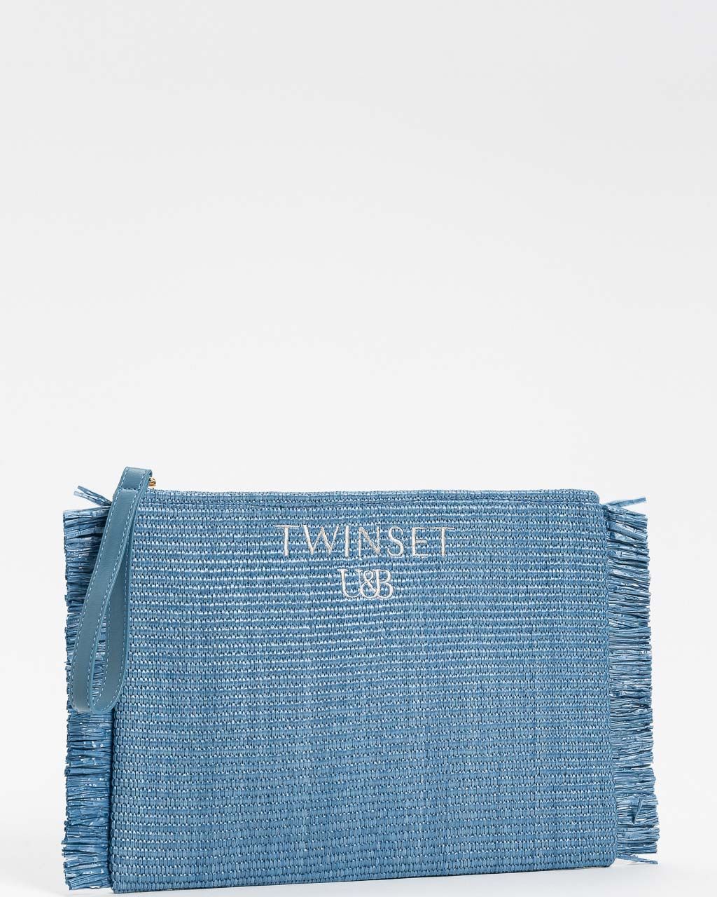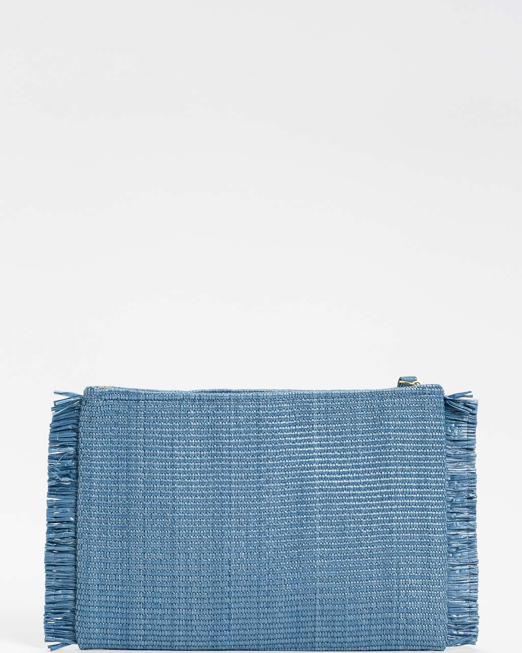 Pochette effetto rafia con frange laterali, logo ricamato a contrasto, foderata.