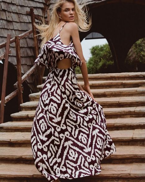 Abito estivo lungo e stampato con ritagli laterali e lunghe balze fluenti, punteggiato da ritagli all’altezza della vita.