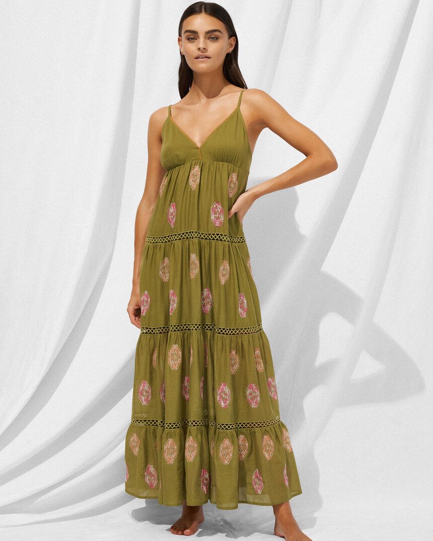 Abito con spalline sottili, profondo scollo a V e generose balze.