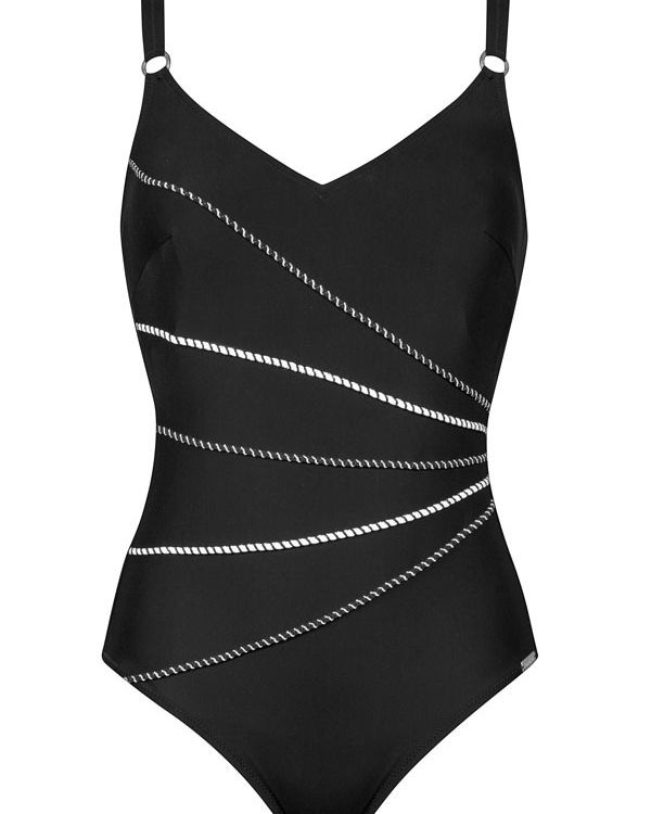 Costume da bagno intero con inserti bianchi, la lycra modella leggermente la figura donando un effetto snellente