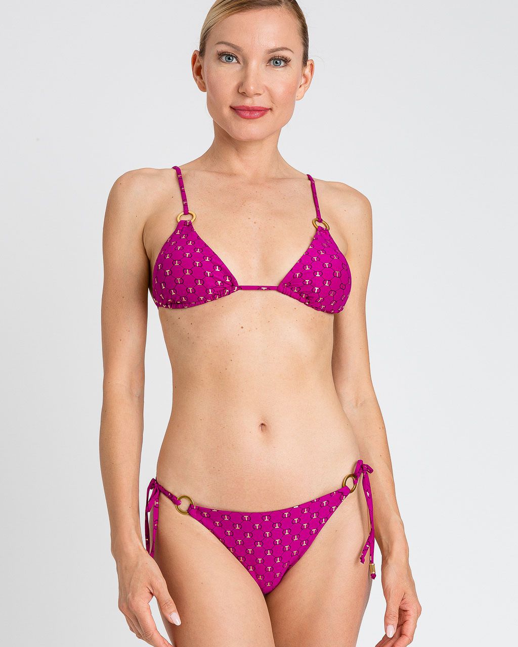 Tanga con anelli dorati fissati ai fianchi e logo a cuore in metallo sul retro, foderata.