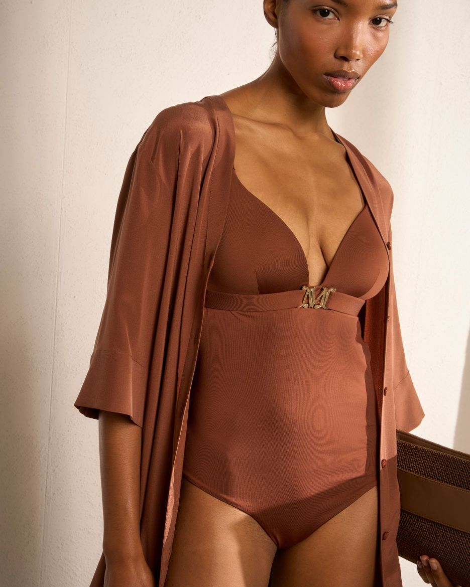 Impreziosito con dettaglio in metallo color oro a forma di M monogram al centro della scollatura e medaglietta logata sul retro, realizzati in una particolare lega resistente al cloro, al sale e alle creme solari