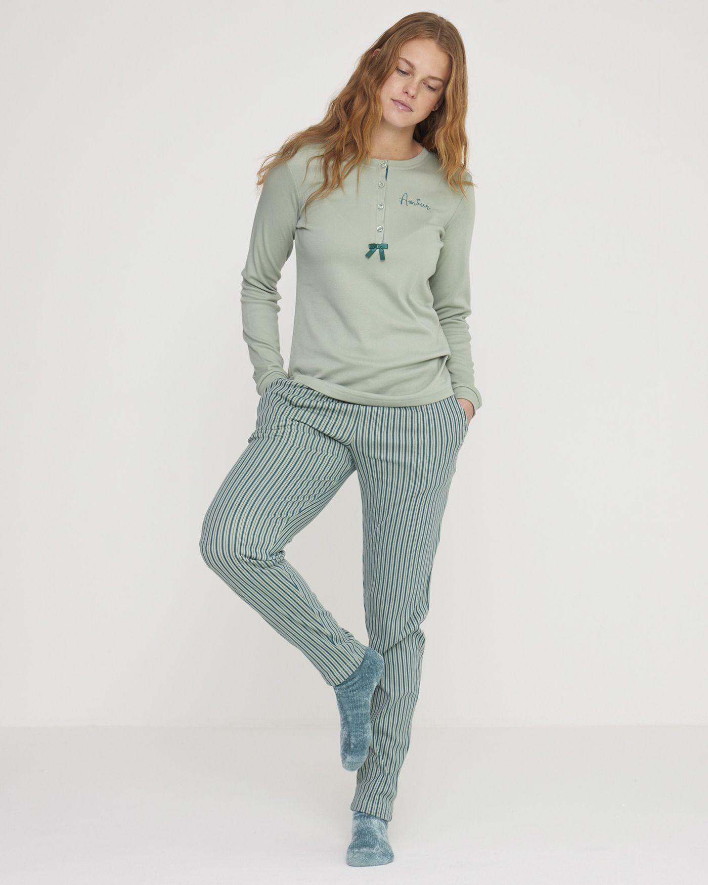 Pigiama donna in morbido caldo cotone con collo a quattro bottoni, top tinta unita con fiocco a contrasto e stampa amour e pantalone lungo senza polsini con elegante stampa a righe