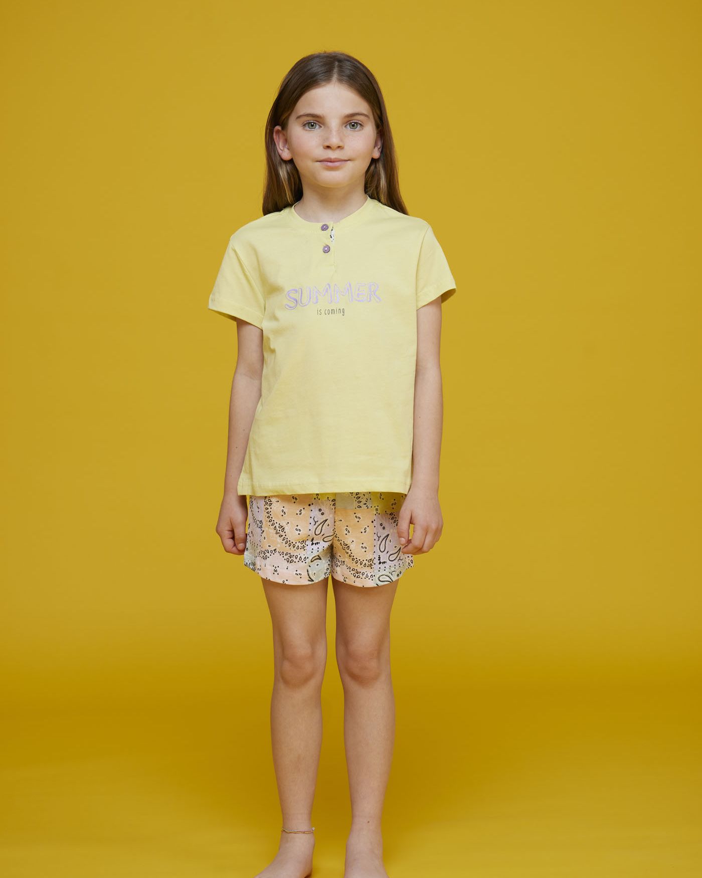 Pigiama bambina corto in cotone, top manica corta con abbottonatura serafino e stampa, pantalone corto