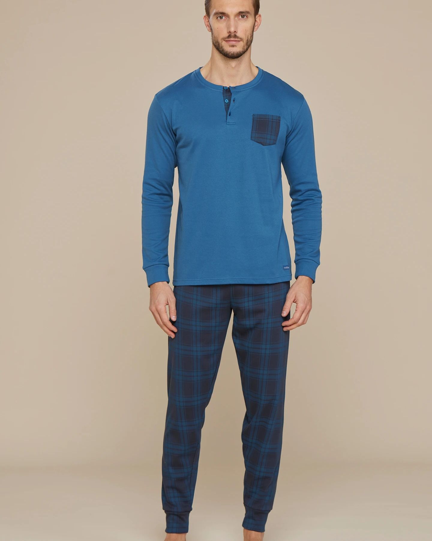Pigiama uomo in caldo cotone felpato, top azzurro con taschino laterale e pantalone con stampa scozzese coulisse, tasche e polsini