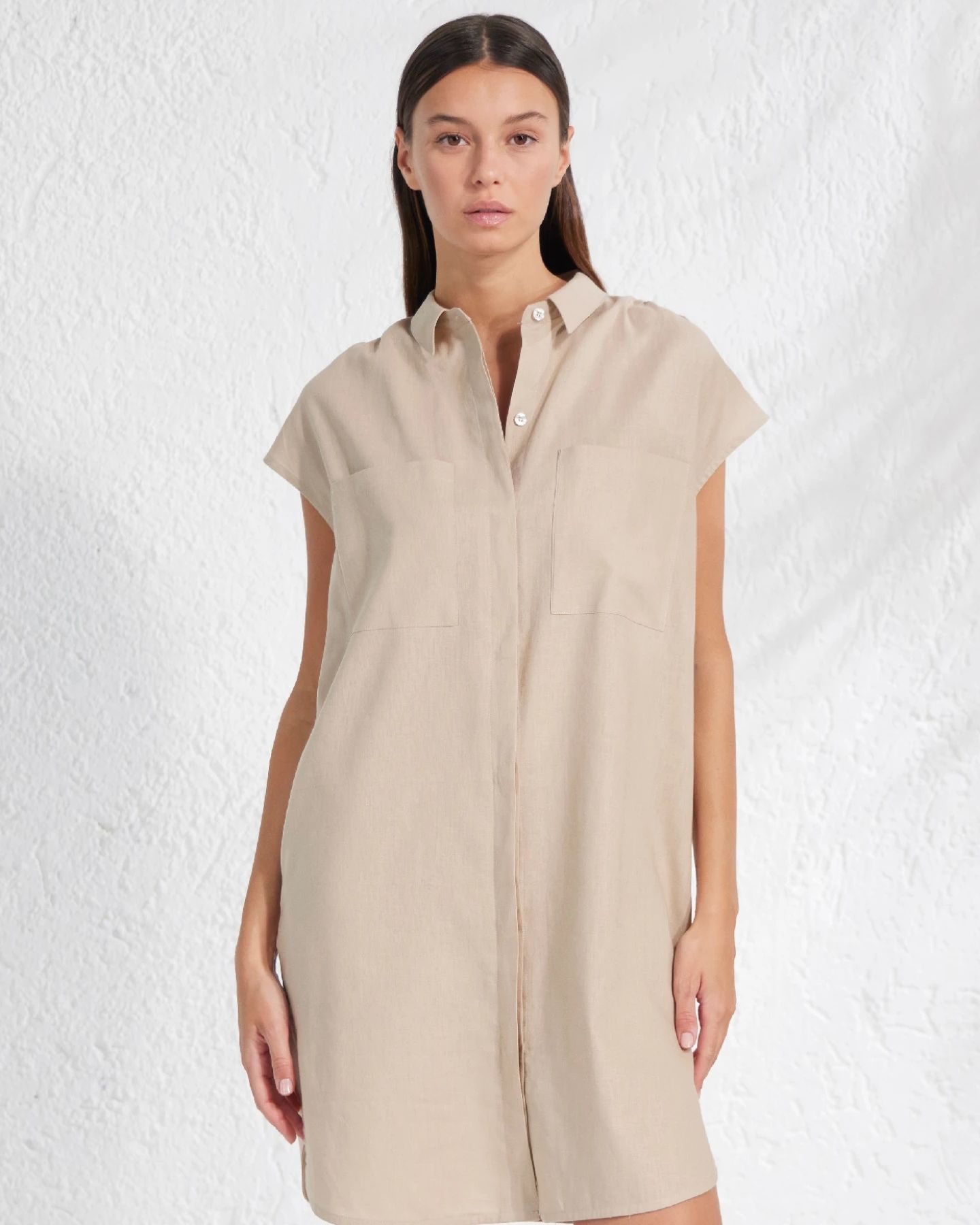 Abito camicia donna in lino con collo camicia, abbottonatura centrale e doppie tasche