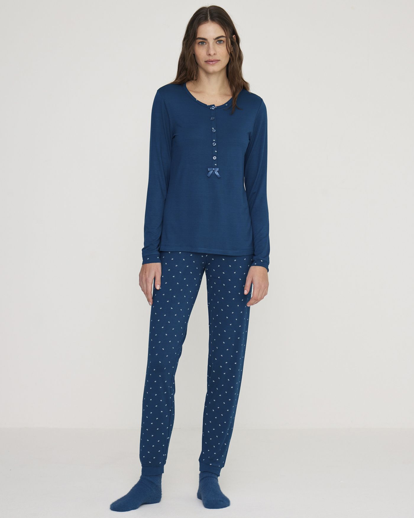 Pigiama donna in morbido e confortevole modal con collo cinque bottoni e dettaglio fiocco e pantalone lungo con comodi polsini in elegante stampa a fiori