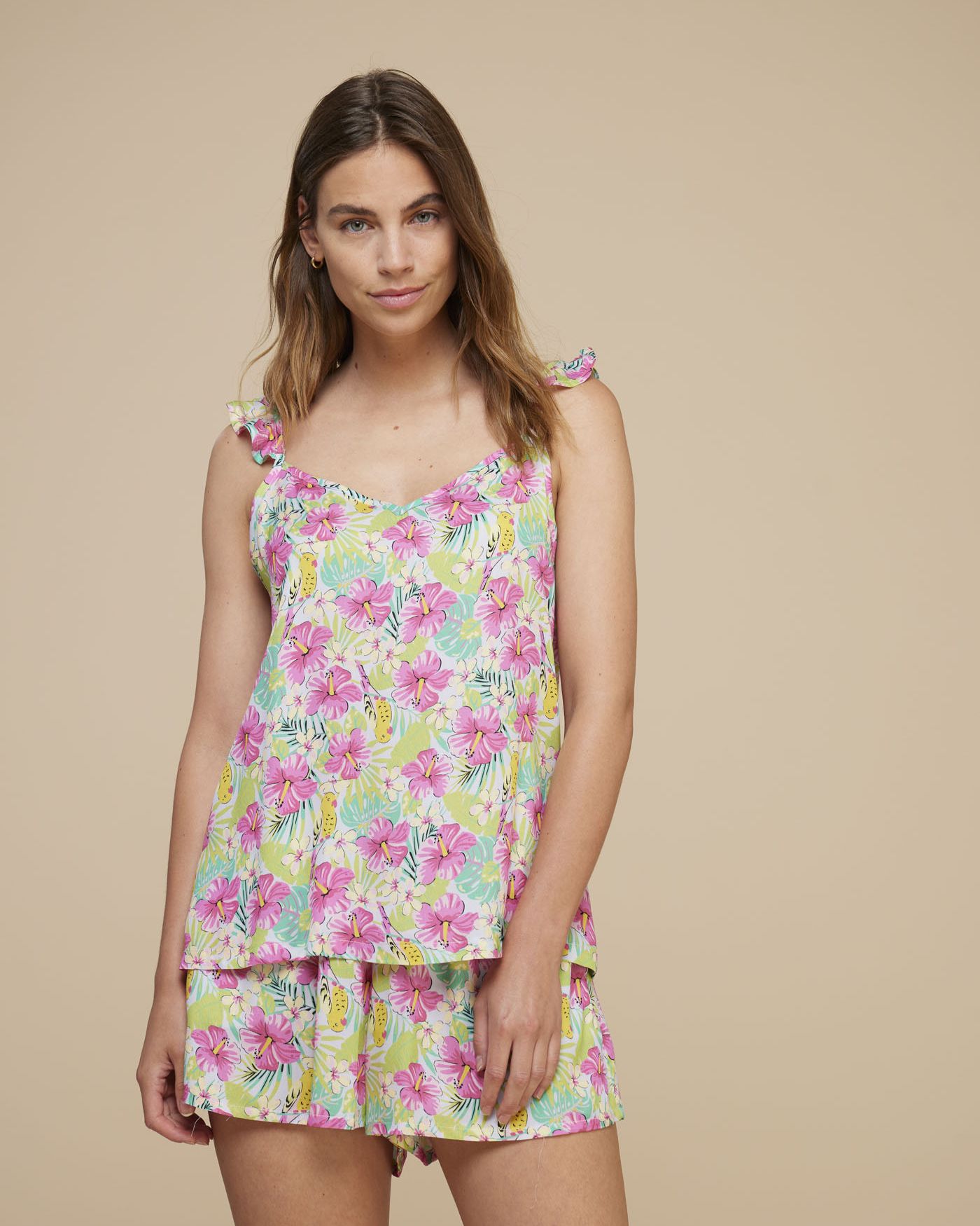 Completo donna viscosa top con dettaglio rouches e pantalone corto