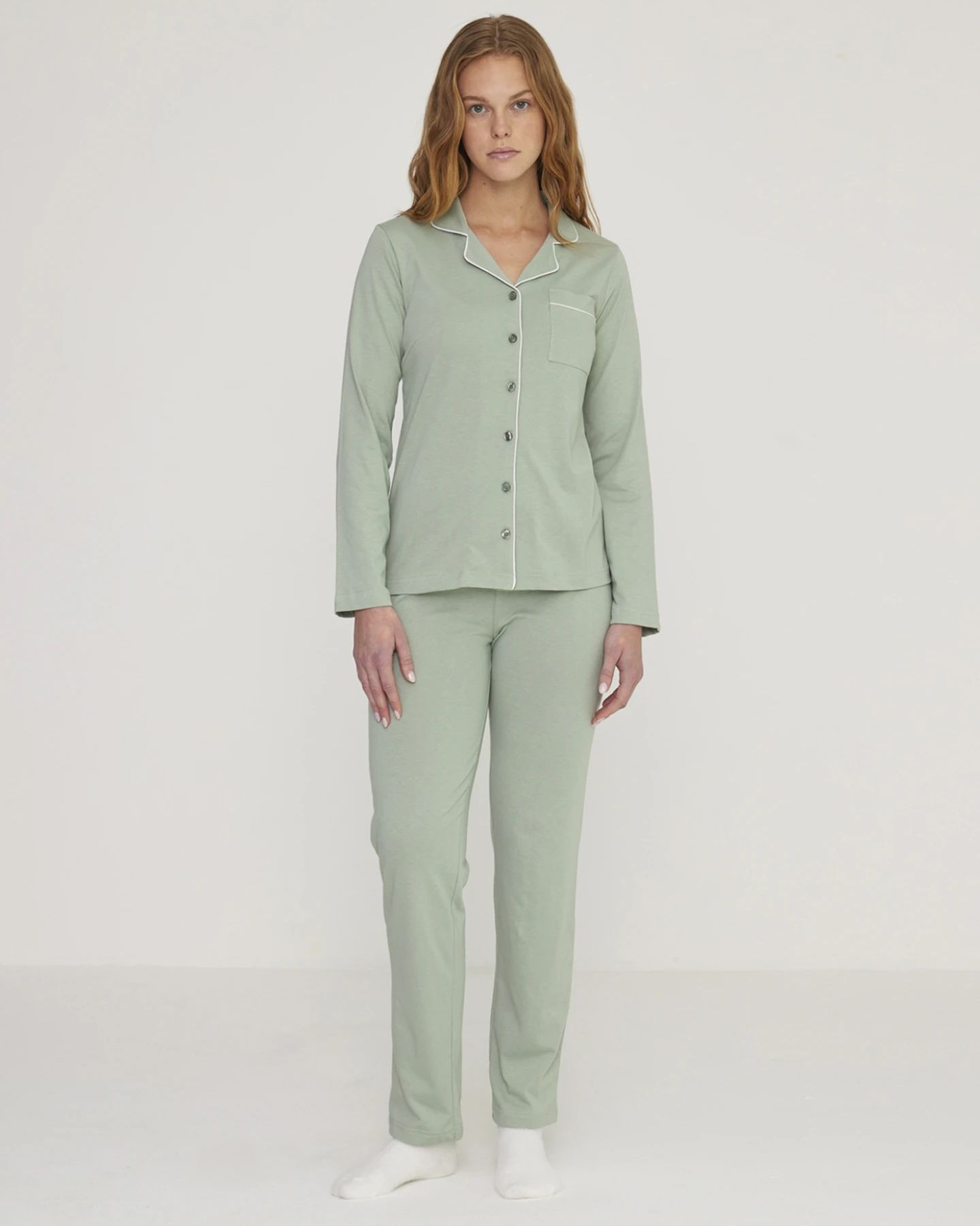 Pigiama donna in morbido jersey invernale in elegante stampa in tinta unita con abbottonatura centrale e taschino e pantalone lungo senza polsini