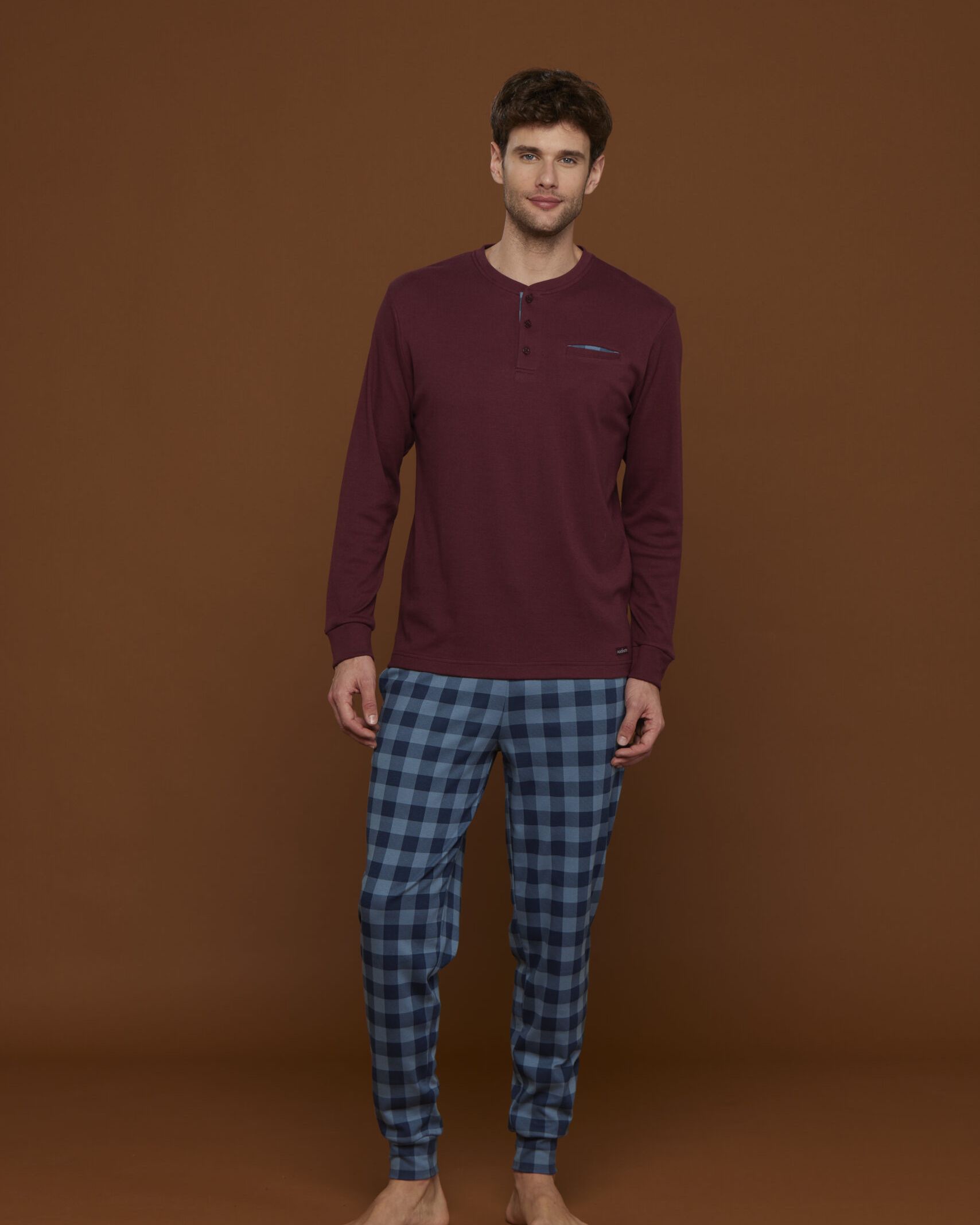 Pigiama uomo IN caldo cotone, top bordeaux con scollo serafino e pantalone con polsini con stampa vichy