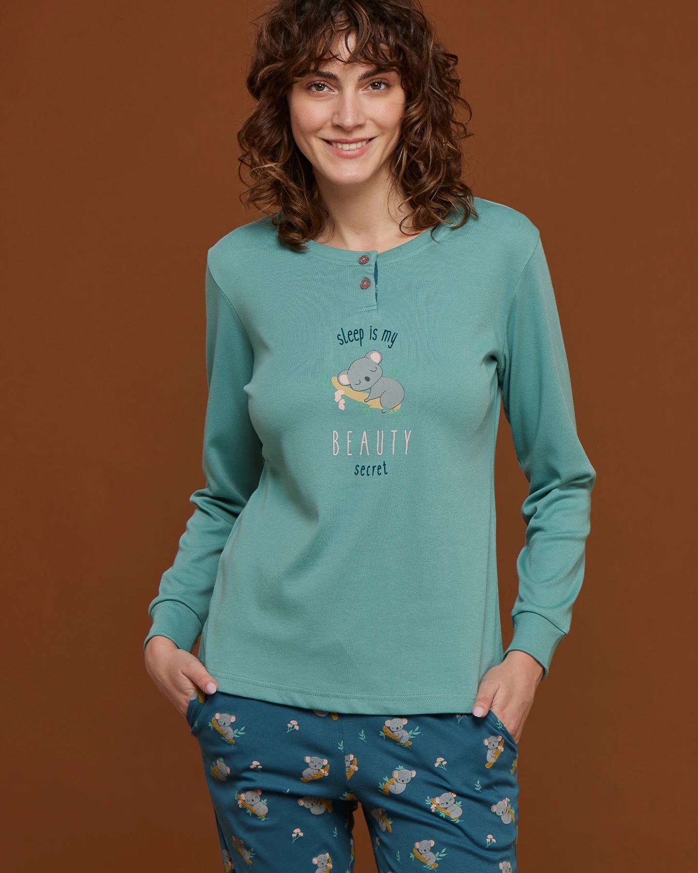 Pigiama donna in caldo cotone, top con scollo serafino, polsino sulla manica e con stampa sul davanti e pantalone con stampa all over con koala, coulisse in vita e con polsino