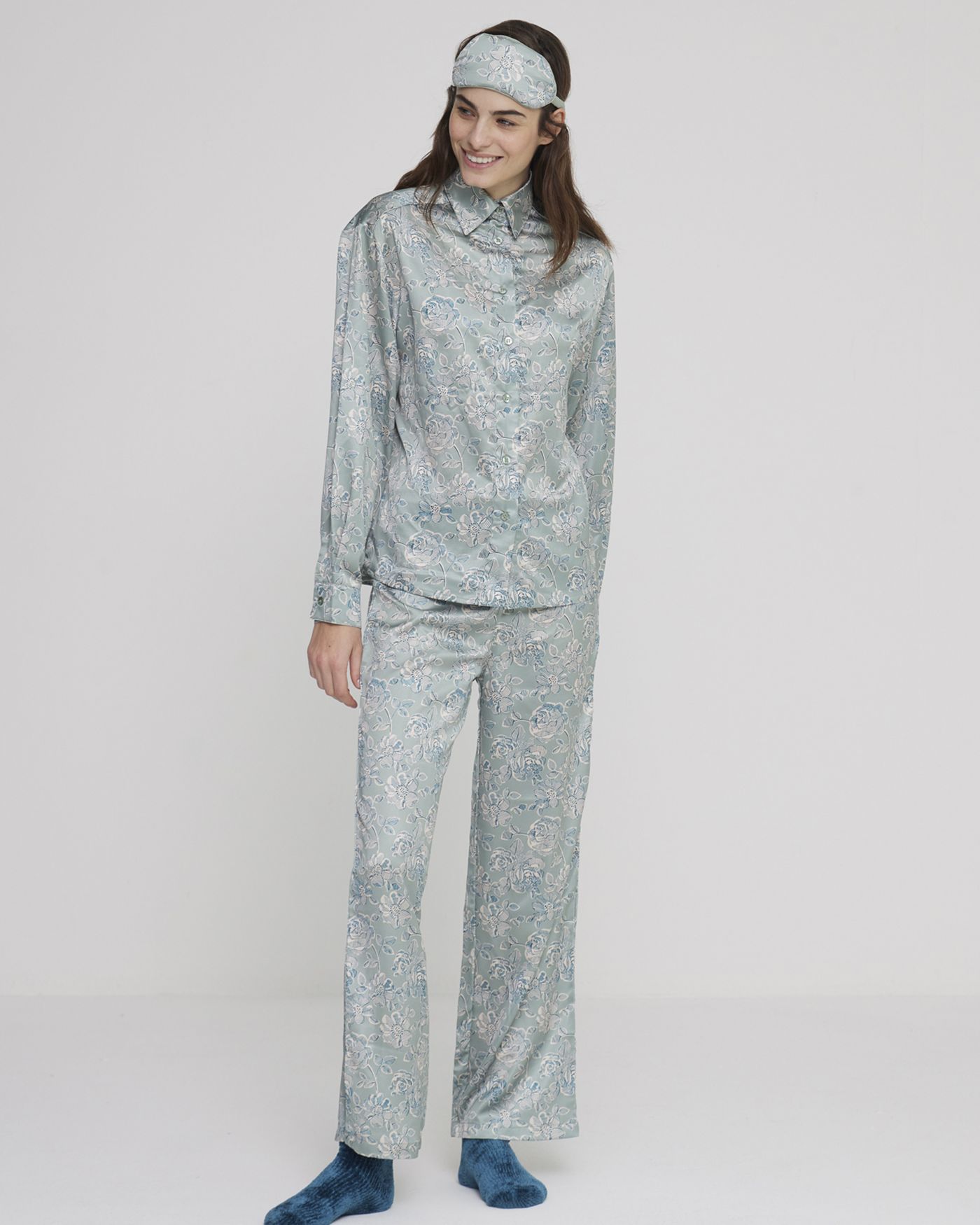 Pigiama donna in morbido raso con collo camicia e comoda abbottonatura centrale e pantalone lungo senza polsini in elegante stampa floreale