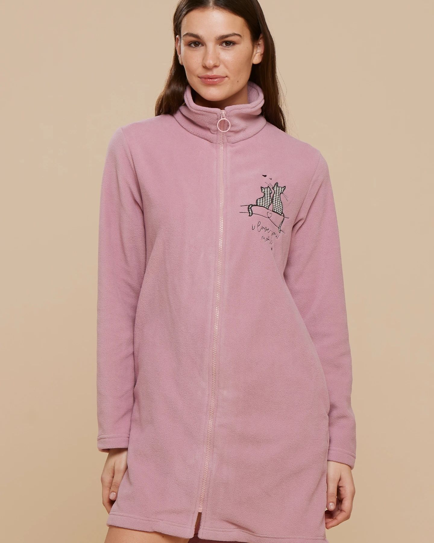 Vestaglia donna in micropile, manica lunga con chiusura zip e stampa gattini pied de poule