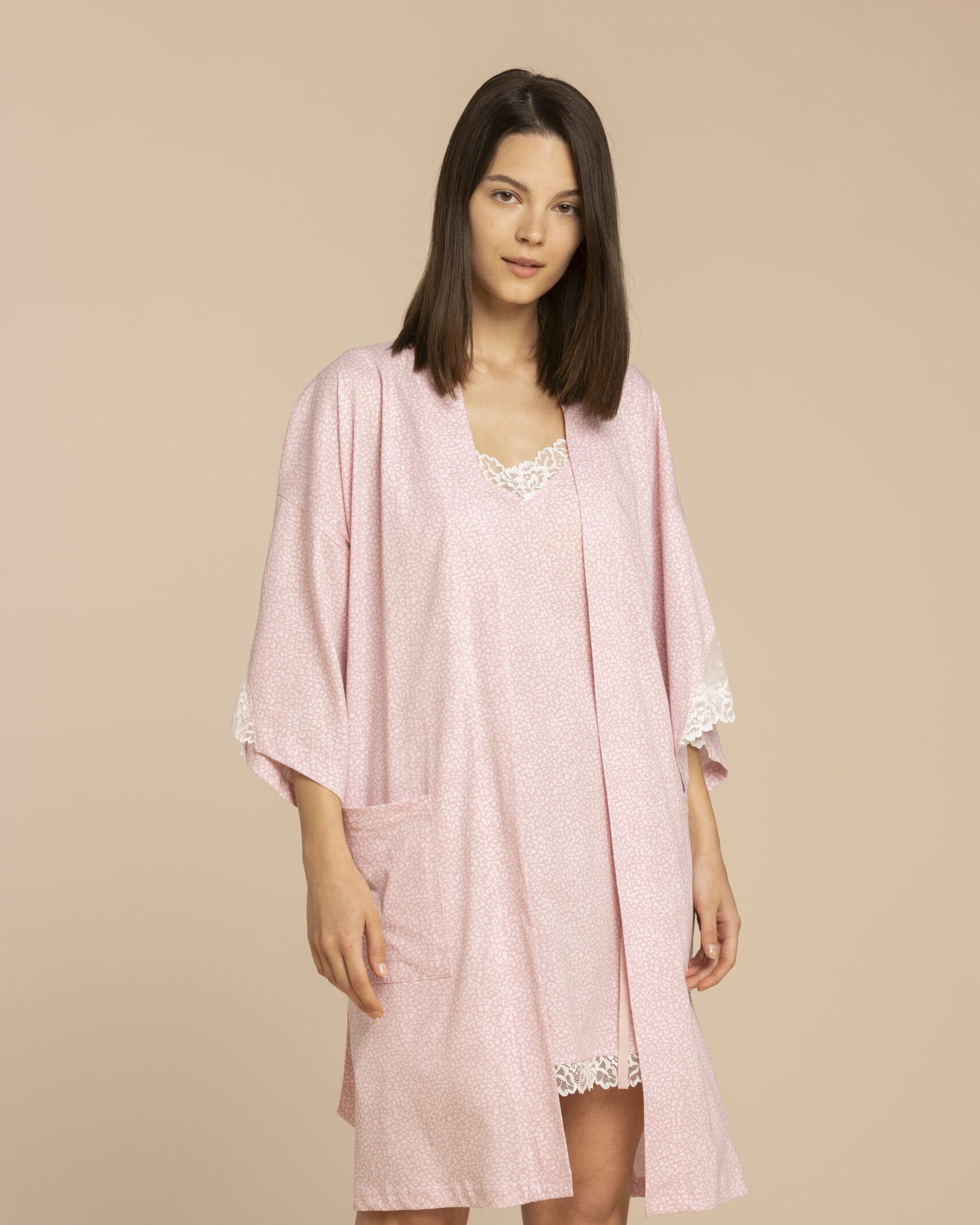 Set coordinato 2 pezzi in cotone, camicia da notte bretellina con stampa maculata e dettagli in pizzo, vestaglia kimono con tasche