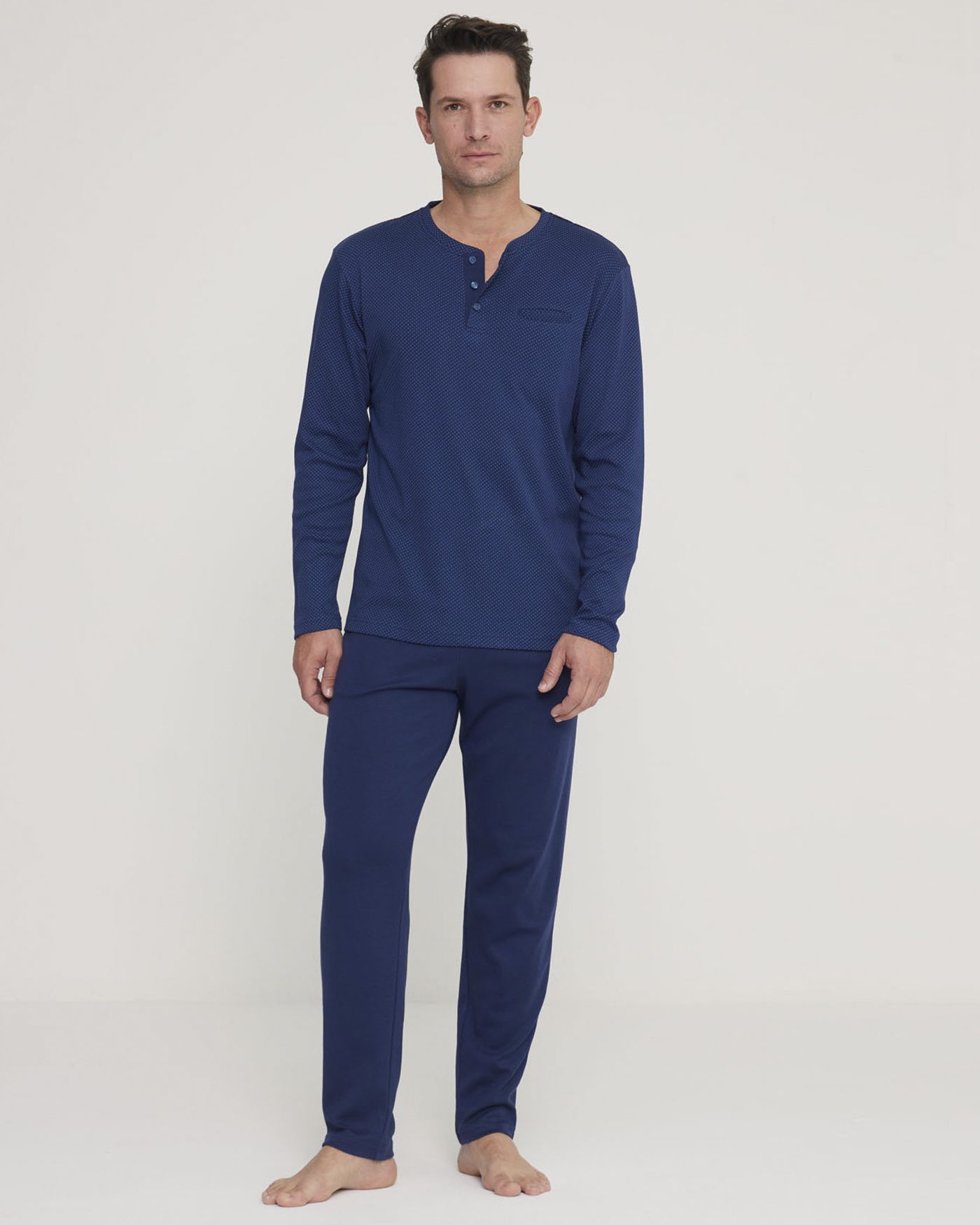 Pigiama Uomo in morbido caldo cotone con collo tre bottoni e raffinata stampa a pois, pantalone tinta unita senza polsini