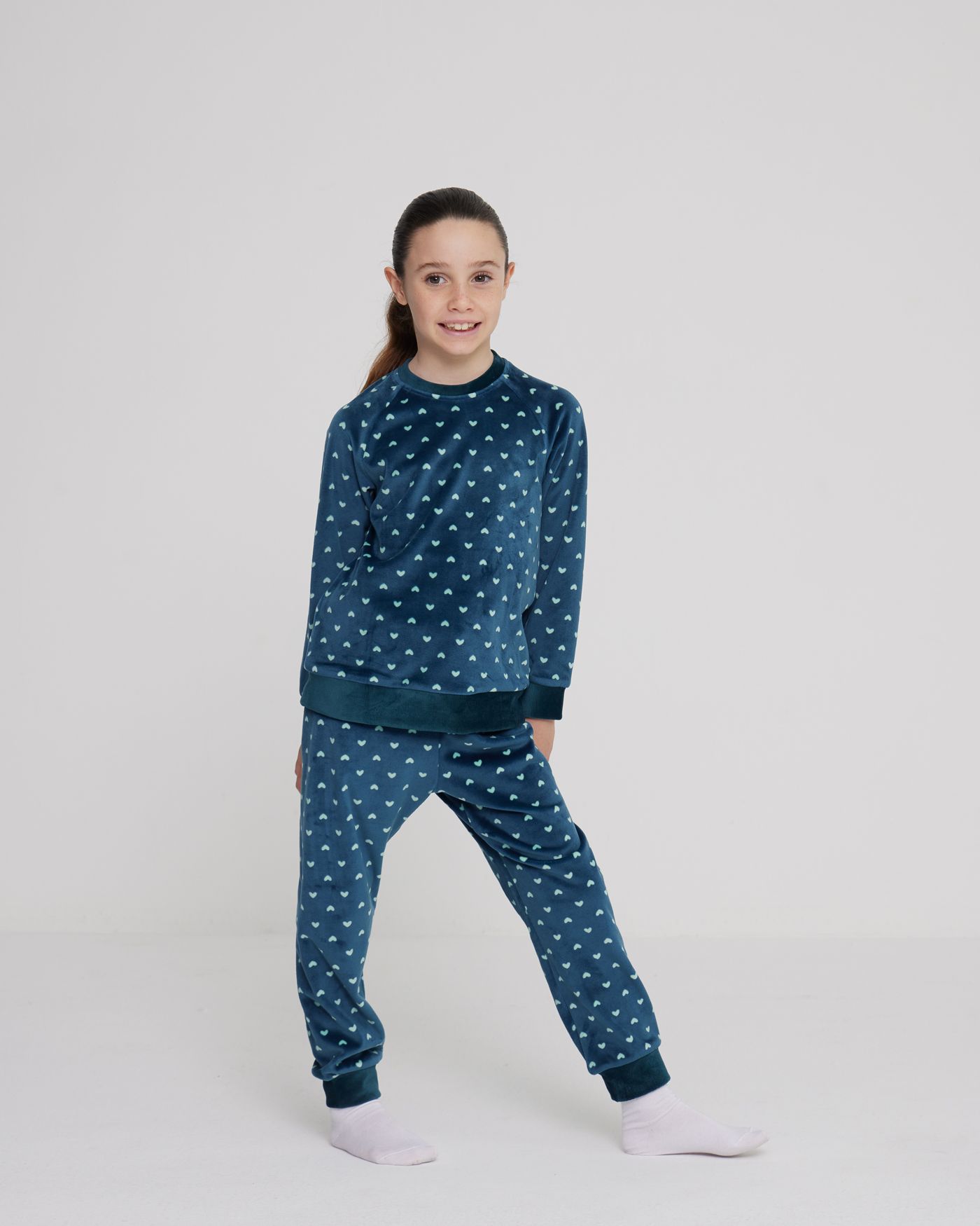 Pigiama bambina in morbida ciniglia felpata soft touch girocollo, romantica stampa a cuoricini all over e polsini in confortevole ciniglia a coste, pantalone lungo con polsini che richiamano il top