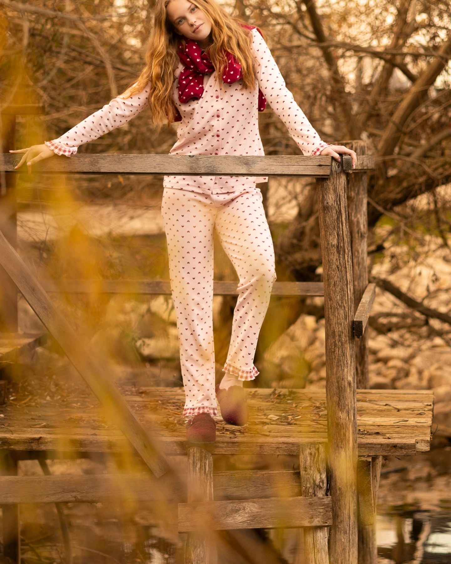 Pigiama donna in morbido caldo cotone con collo camicia in graziosa stampa vichy, abbottonatura centrale, rouches sulle maniche che richiamano il collo e pantalone lungo in romantica stampa all over a cuoricini con rouches sul fondo