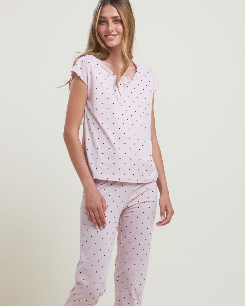 Pigiama Donna con Top Giromanica con stampa pois e scollo con dettaglio in pizzo