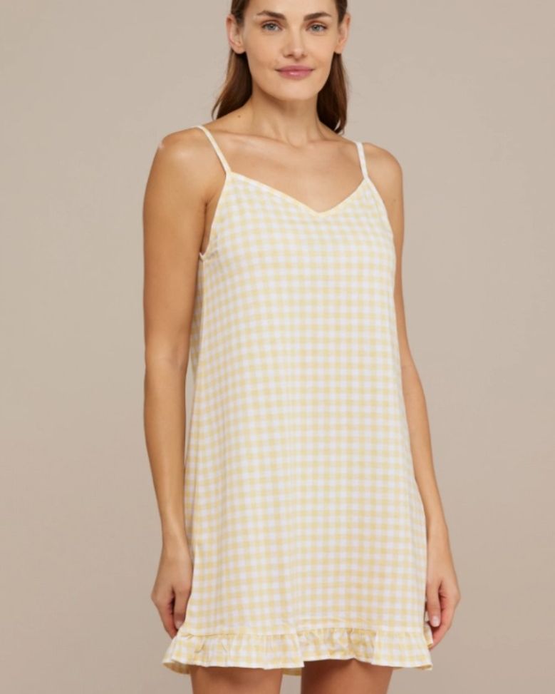 Camicia da notte donna in cotone con bretellina, scollo a V, stampa vichy e rouches