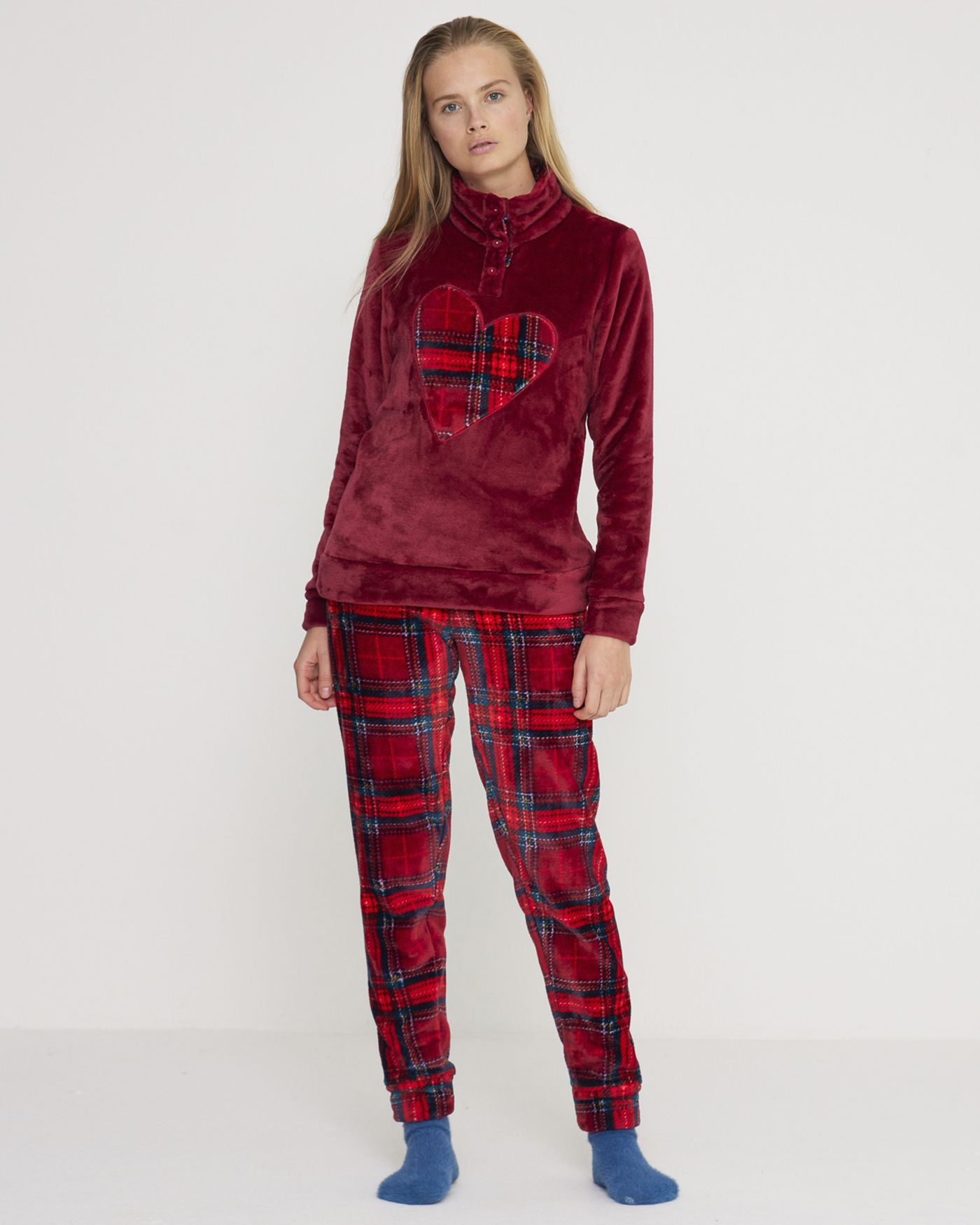 Pigiama donna in morbido coral con collo tre bottoni e applicazione cuore con pantalone lungo con polsini in raffinata stampa scozzese che richiama il top