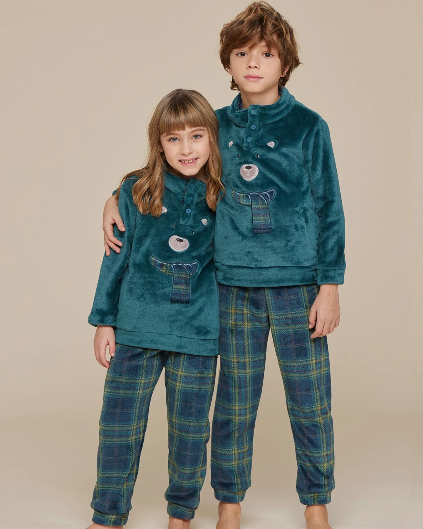 Pigiama bambino/a coral xmas bear top manica lunga con polsini e applicazione orsetto e pantalone lungo con polsini con stampa scozzese
