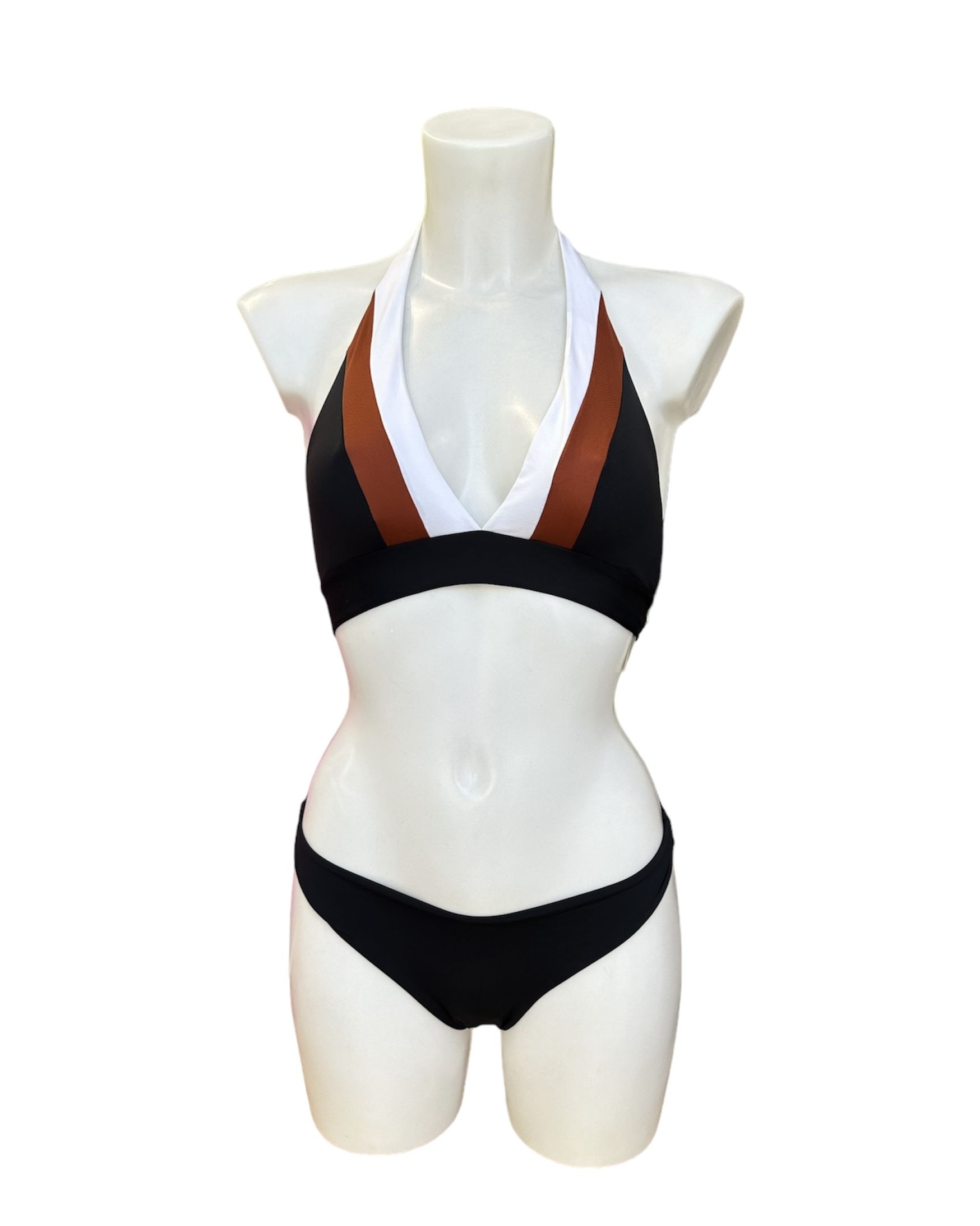 Costume bikini realizzato in jersey jacquard, foderato e caratterizzato da un motivo color block con riga in lurex e riga unita sul davanti e tinta unita sul retro.