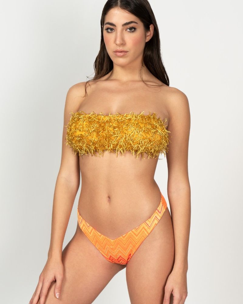 Costume da bagno, collezione SS22 del Mood Bali. Bikini Donna, modello fascia con slip Americano fisso, in tessuto lycra lucida arancione. Capo dotato di imbottitura interna estraibile, dettaglio piume su coppe.
